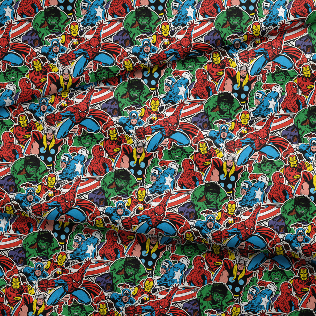 Classic Marvel comics collage featuring iconic Super Heroes in vibrant retro style which showcases the Avengers, Spider-Man, and other fan-favorite characters from vintage comic books. Perfect for crafting projects or kid's room decor.