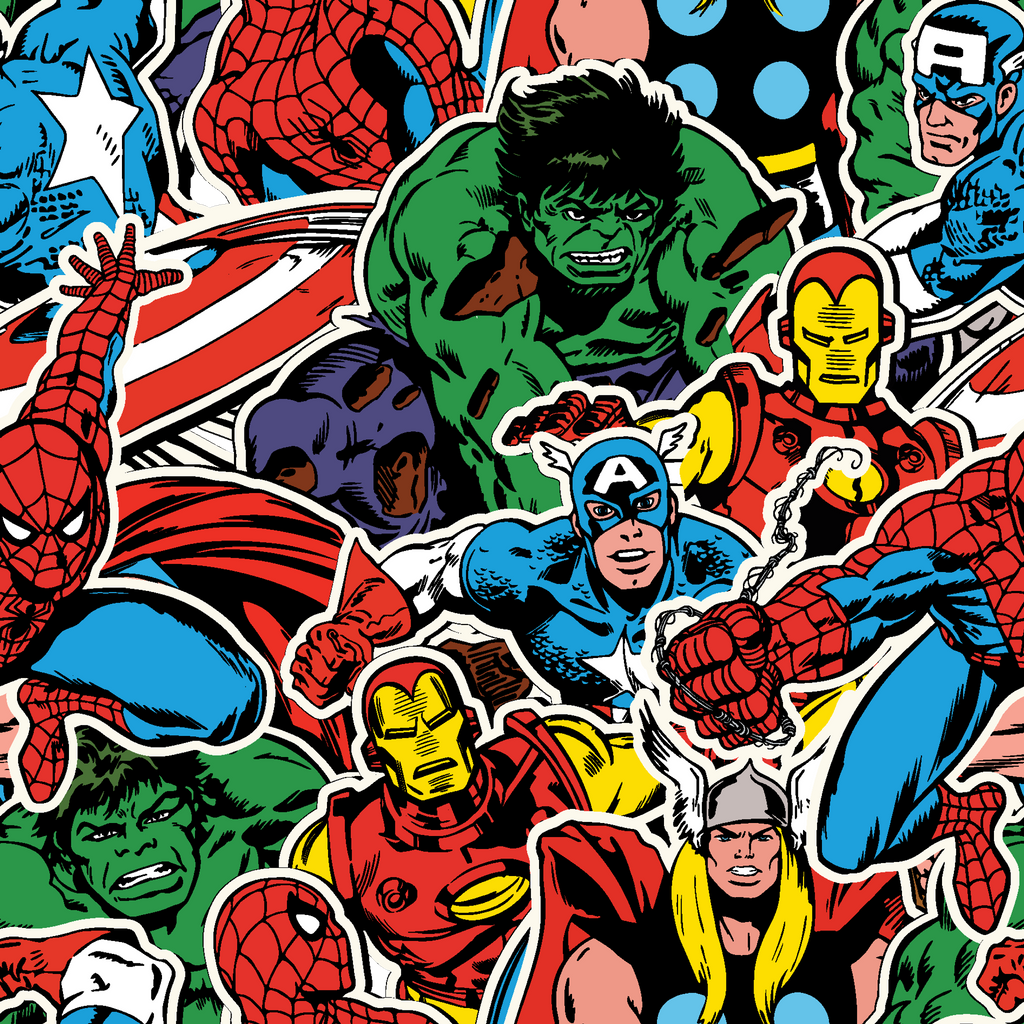 Classic Marvel comics collage featuring iconic Super Heroes in vibrant retro style which showcases the Avengers, Spider-Man, and other fan-favorite characters from vintage comic books. Perfect for kid's rooms and playrooms.
