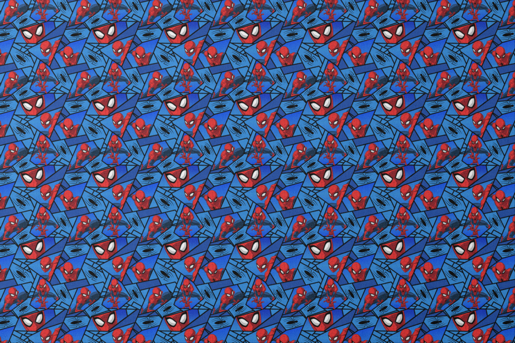 Vibrant Marvel Spider-Man comic fabric featuring the iconic Super Hero in various action poses against a striking blue background with geometric web patterns.