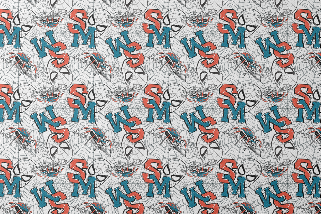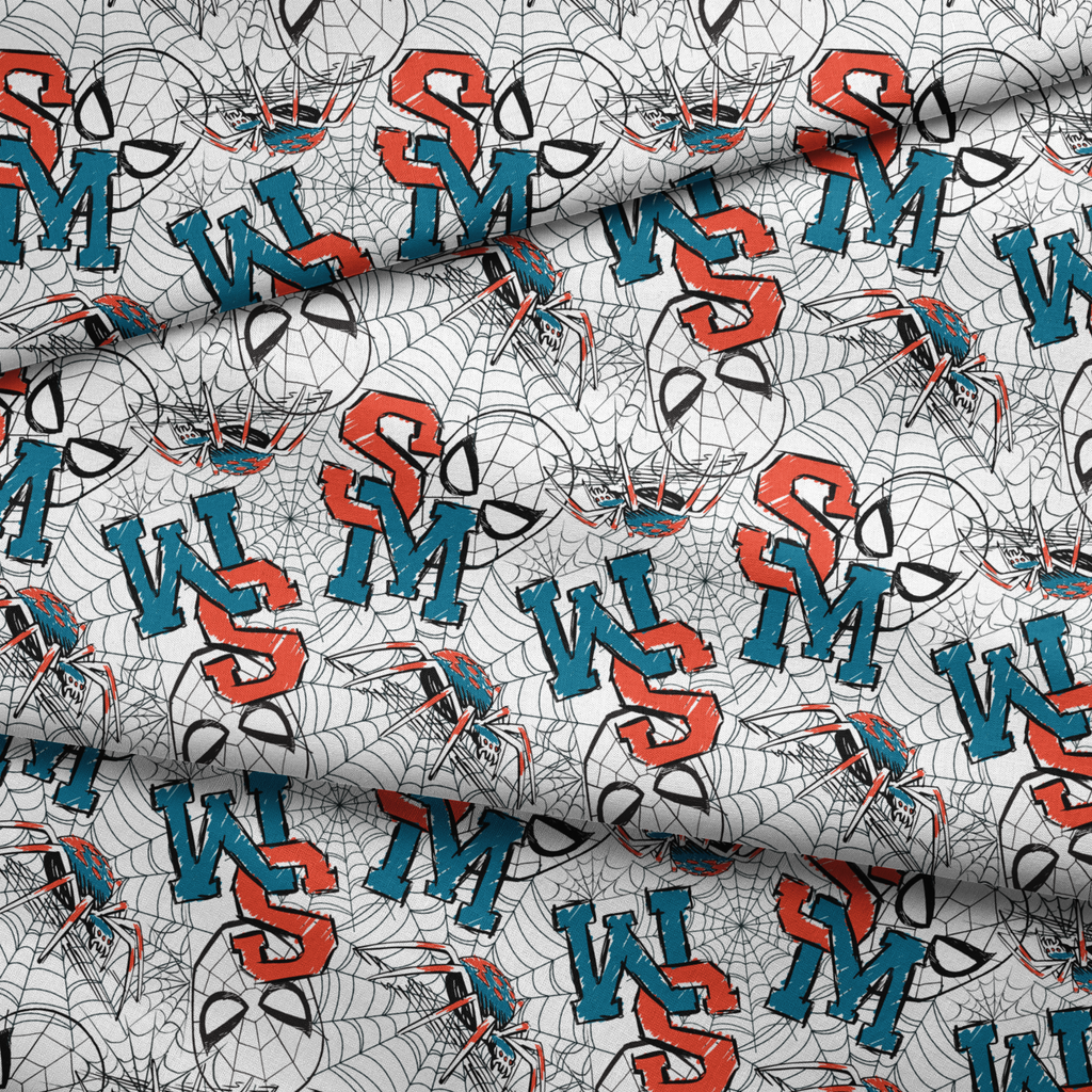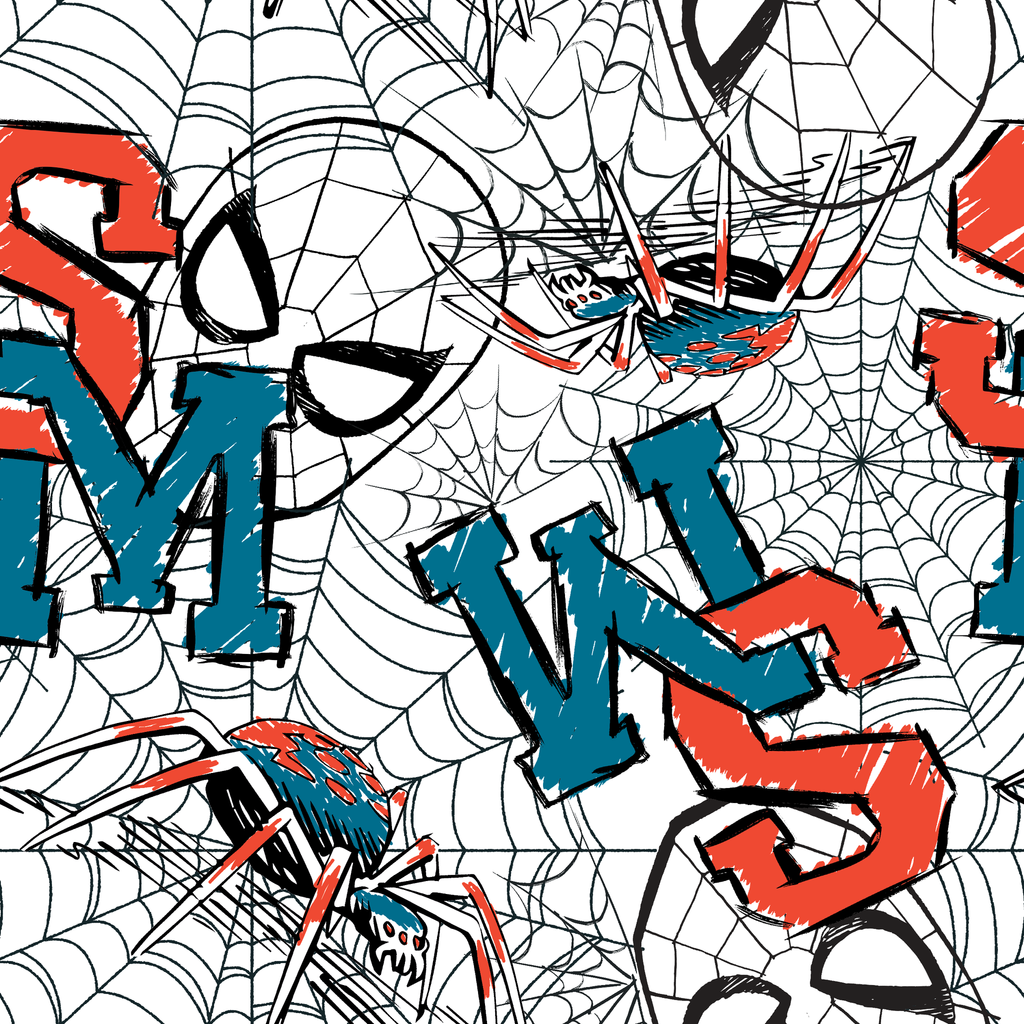 Spooky Spider Man web pattern in teal blue and red with trendy grunge texture. Perfect for Halloween decor, modern apparel or gothic-inspired home accessories.