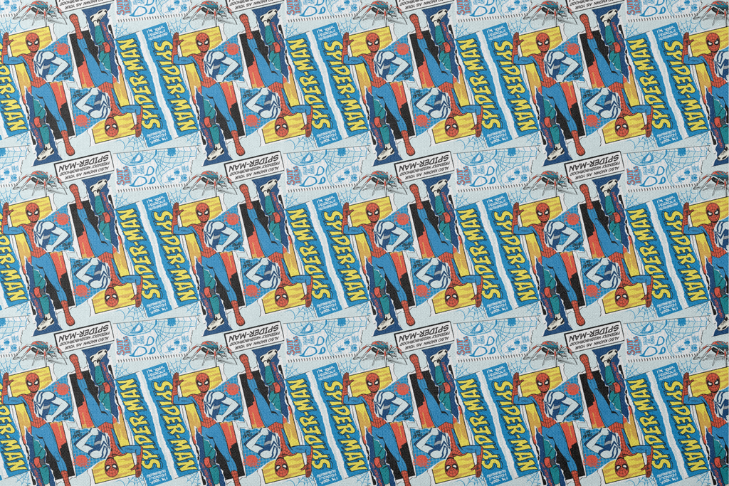 This vibrant Spider-Man fabric design features comic-inspired graphics in bold red and blue, perfect for Super Hero fans and Marvel-themed projects.