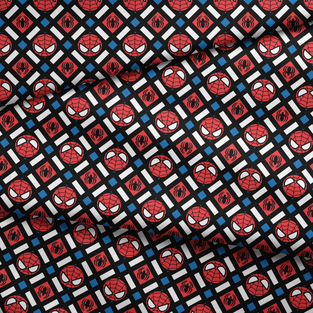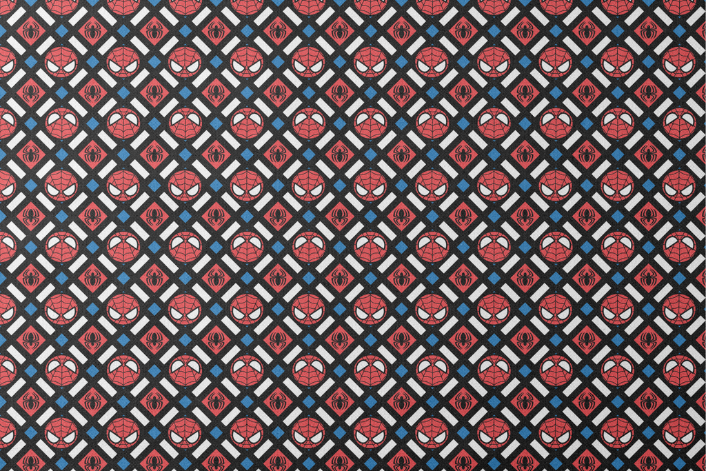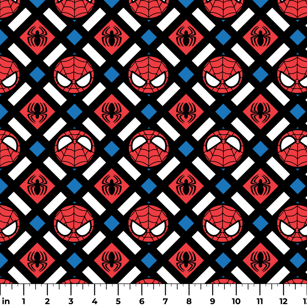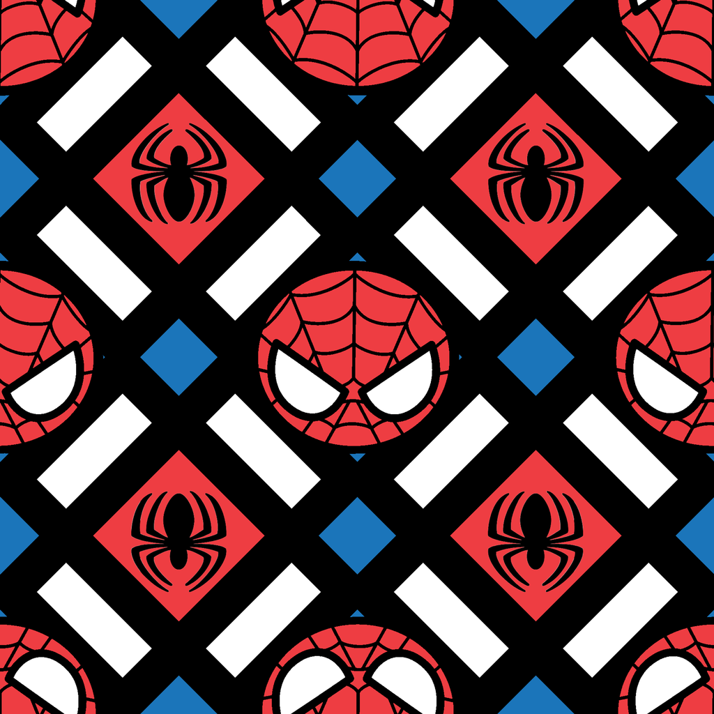 Classic Spider-Man inspired pattern featuring iconic red masks and spider emblems arranged in a geometric diamond grid with blue accents on black background.