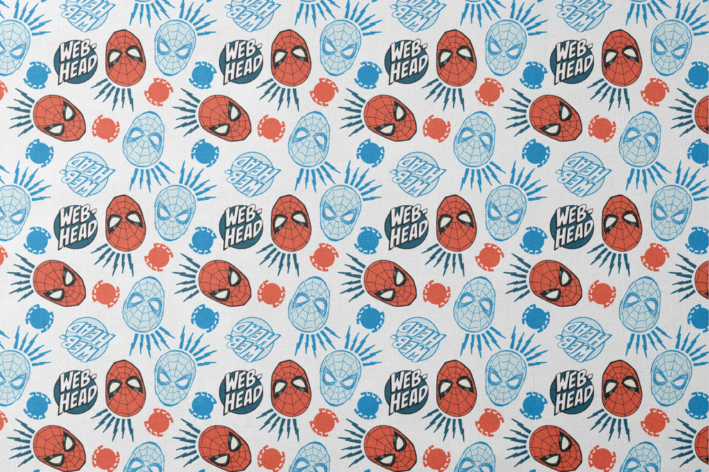 Colorful Spider-Man pattern featuring cartoon-style web-slinger faces in red and blue with "WEB HEAD" text and graphic elements on a white background - perfect for superhero fans and comic book collectors.