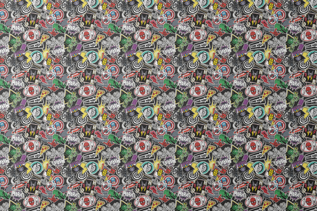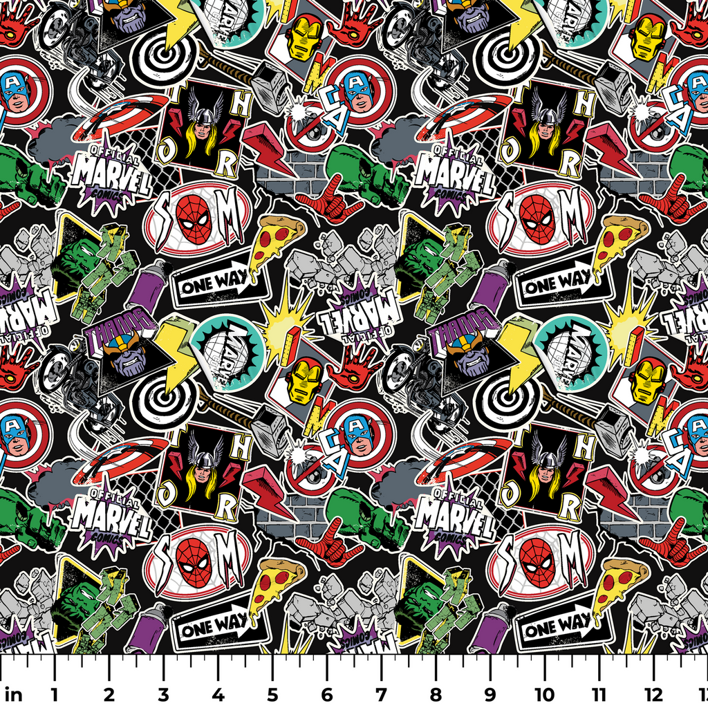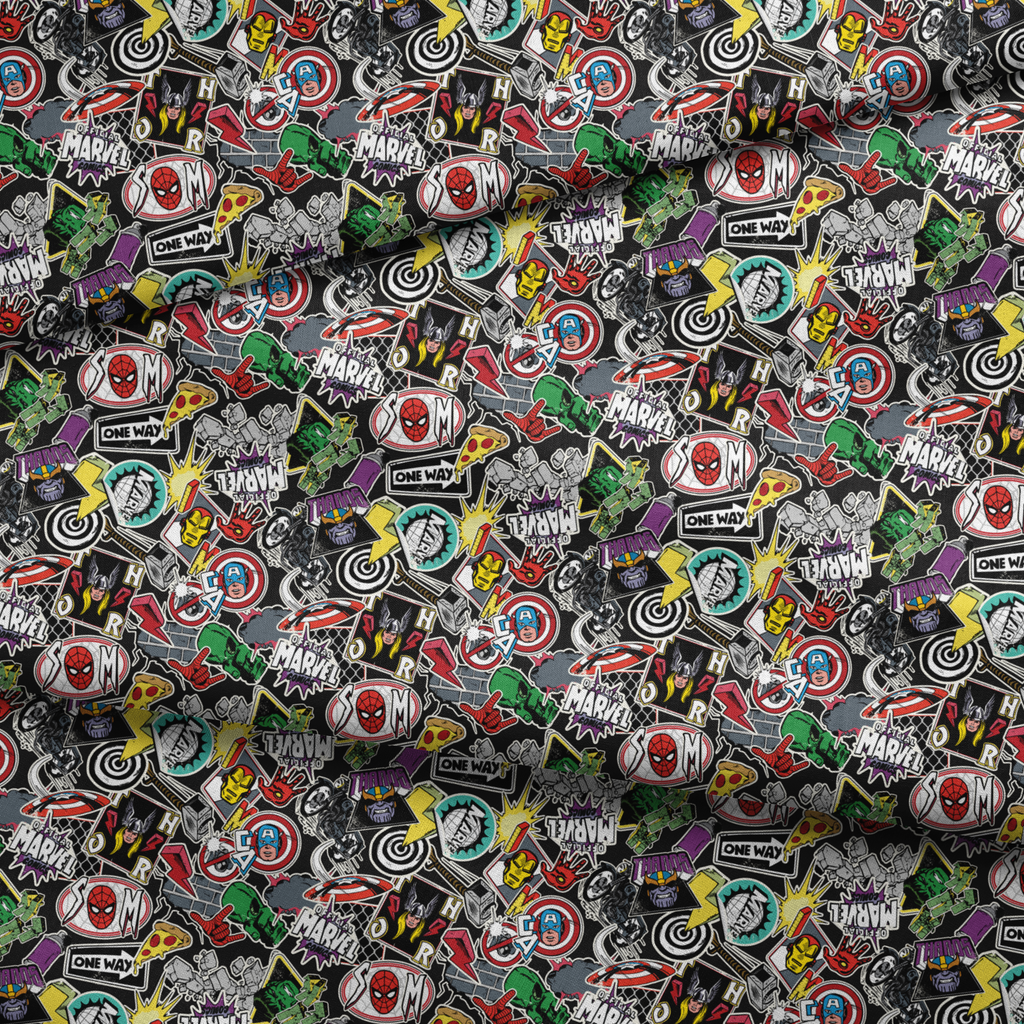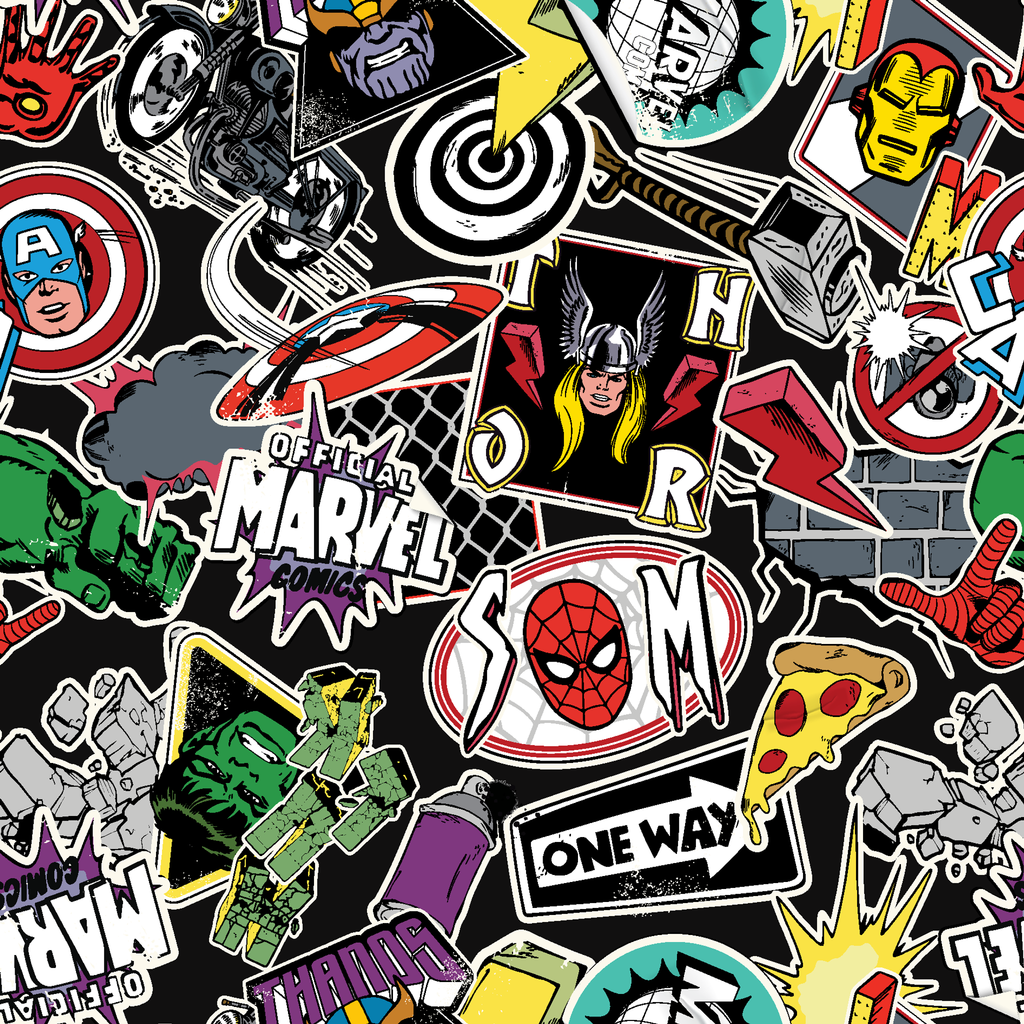 This cool Marvel comics sticker toss features iconic Super Hero logos and symbols including Spider-Man, Captain America, Hulk and more hero favorites on a black background.