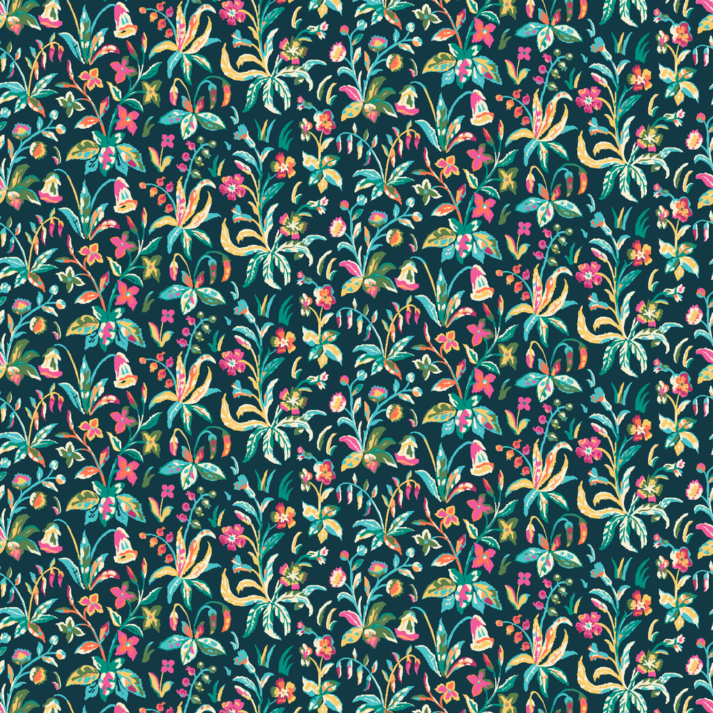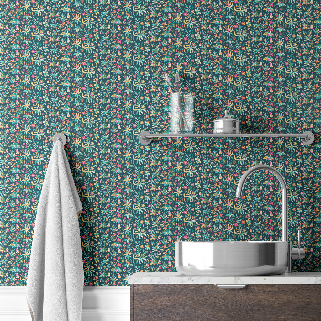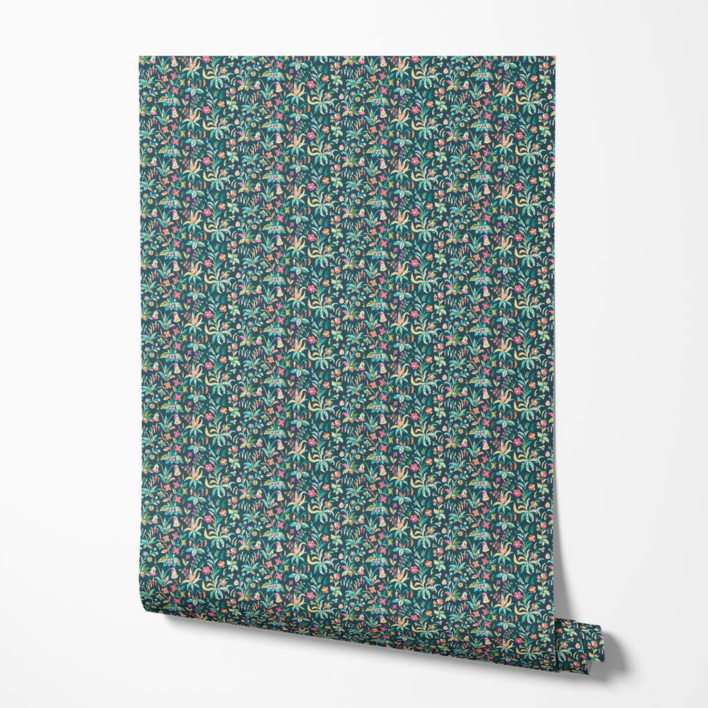 Vibrant tropical floral pattern featuring colorful exotic flowers and leaves on a dark teal background, perfect for adding a whimsical botanical touch to any space.