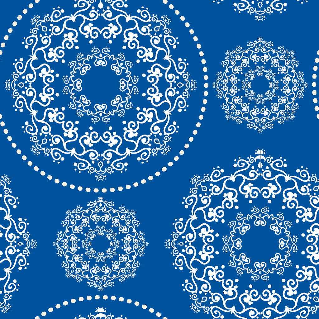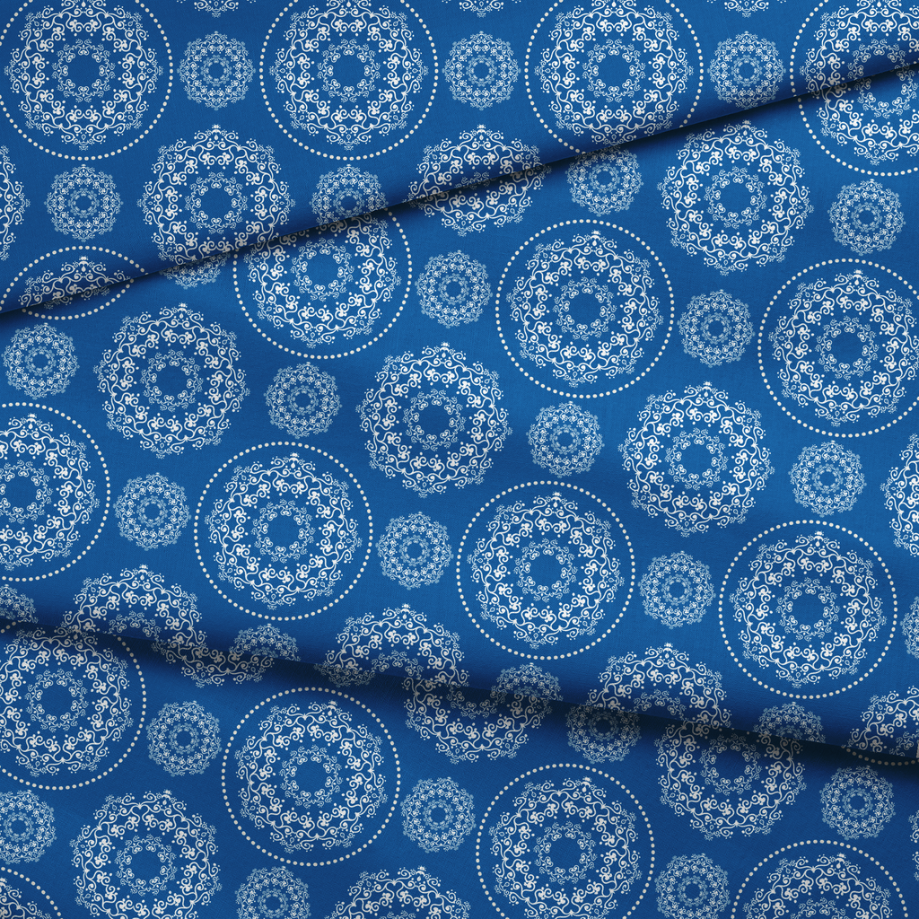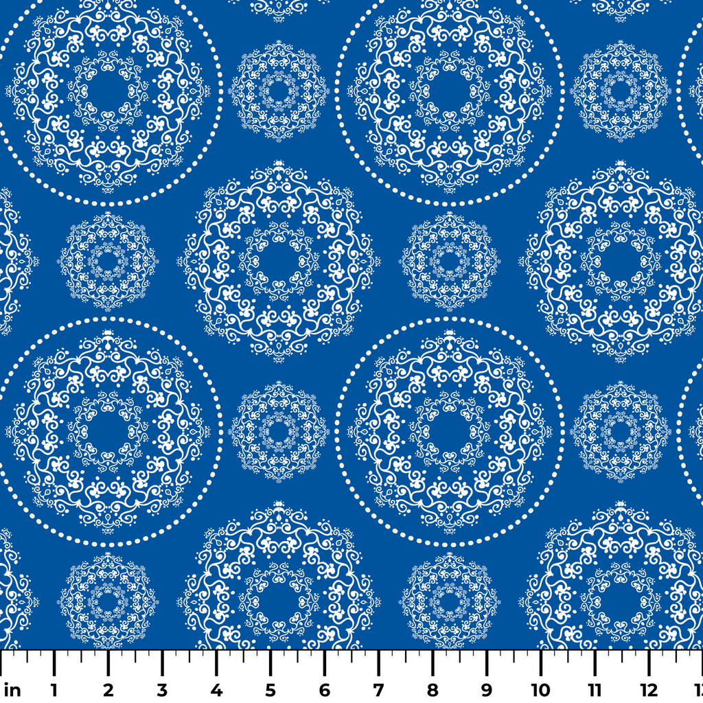 Intricate white medallions dance across a bold blue background, creating a striking contrast that catches the eye. The ornate circular designs feature delicate swirls and curlicues reminiscent of porcelain patterns, giving this fabric a timeless elegance with modern appeal. This versatile design would make stunning throw pillows for your living space or a show-stopping tablecloth for special gatherings.