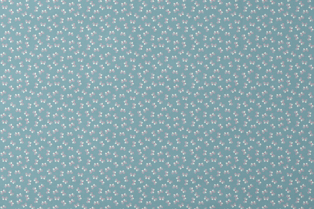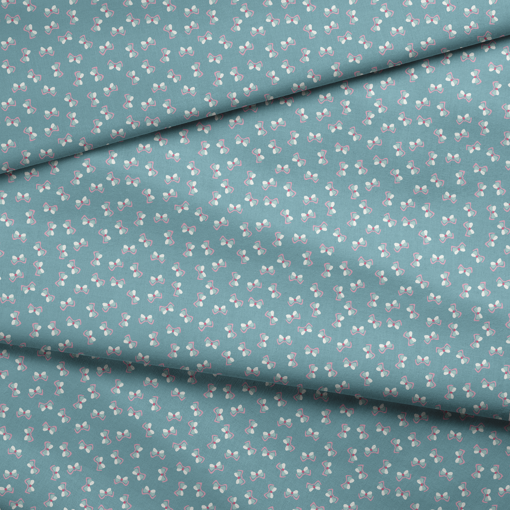 Whimsical pink and white bows pattern on a soft blue background, perfect for playful apparel and children's decor with the scattered feminine motifs.