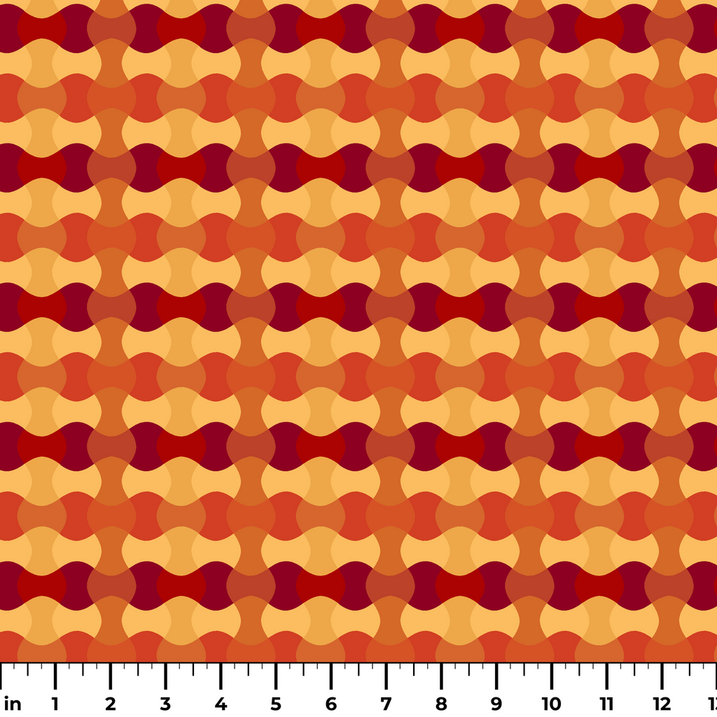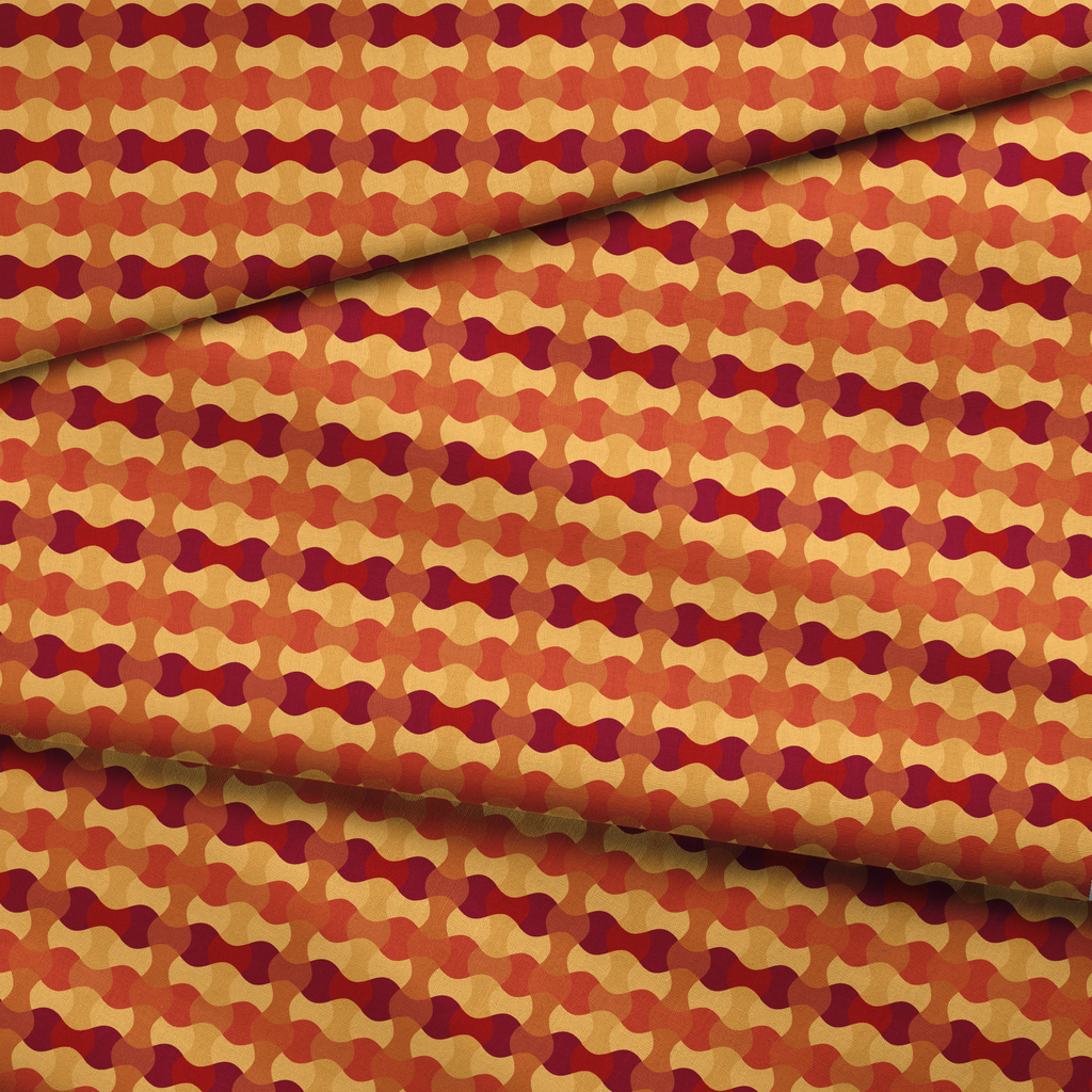 A warm geometric pattern featuring wavy interconnected lines in rich burgundy, burnt orange, gold, and caramel tones, perfect for contemporary home decor with a retro 70s feel.