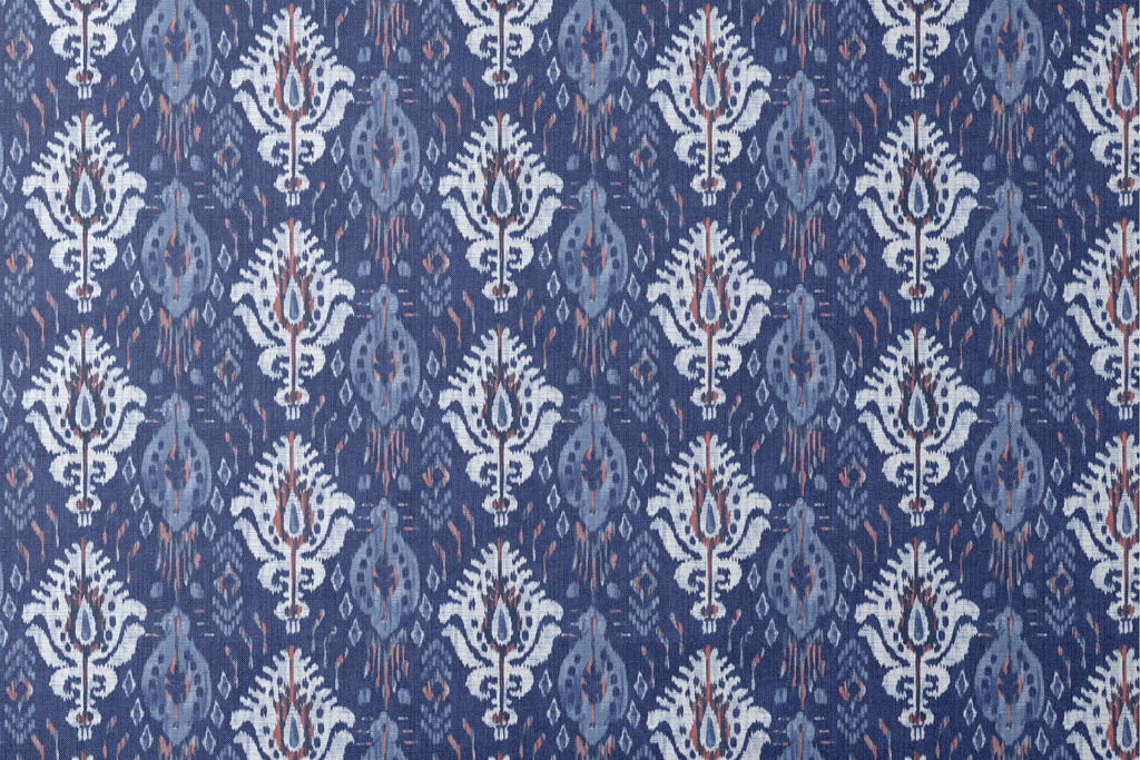 Rich navy blue ikat fabric splashed with crisp white botanical motifs and subtle brown accents creates a striking handcrafted look. The textured design resembles traditional hand-dyed techniques with its slightly blurred edges and organic imperfections. Perfect for statement throw pillows or coastal-inspired window treatments that bring depth and personality to your space.