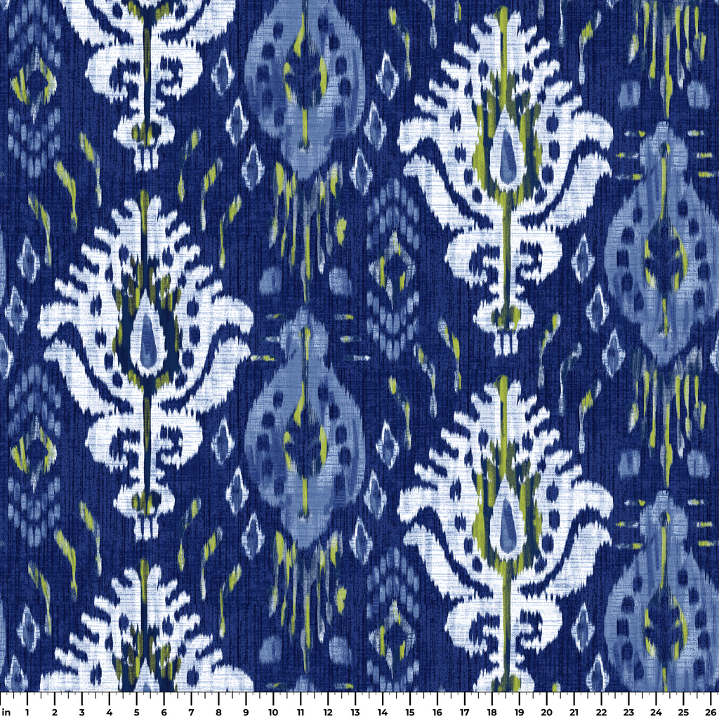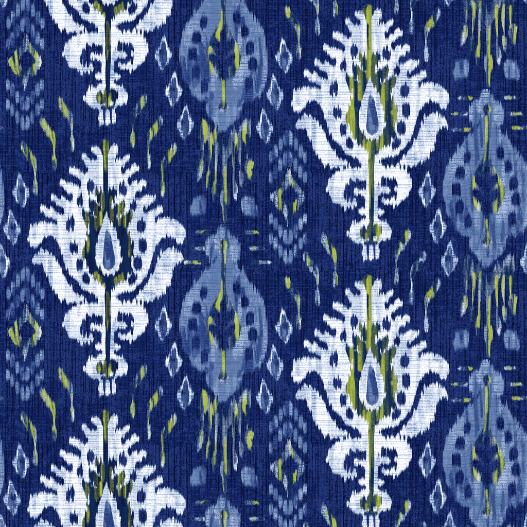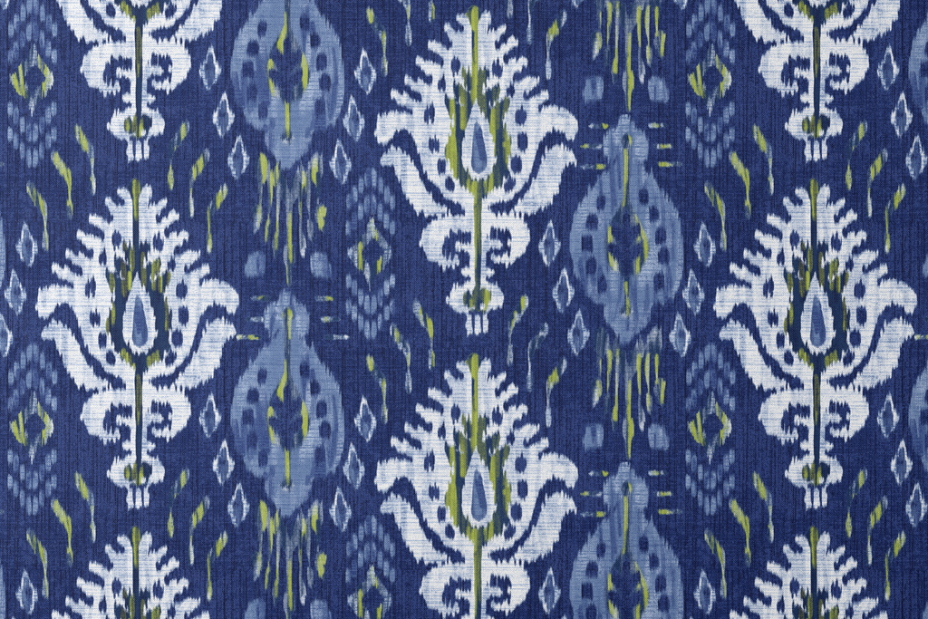 Rich indigo blues dance with crisp white motifs in this striking ikat-inspired pattern, accented with unexpected pops of chartreuse green. The blurred edges of the floral and geometric designs create a watercolor effect that adds movement and depth to this design. Perfect for statement throw pillows or a bold window treatment that brings instant character to neutral spaces.