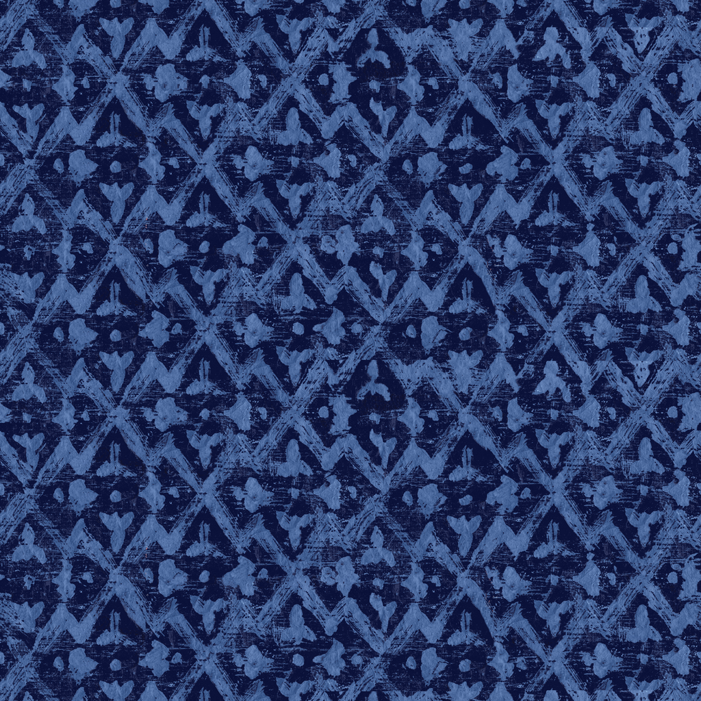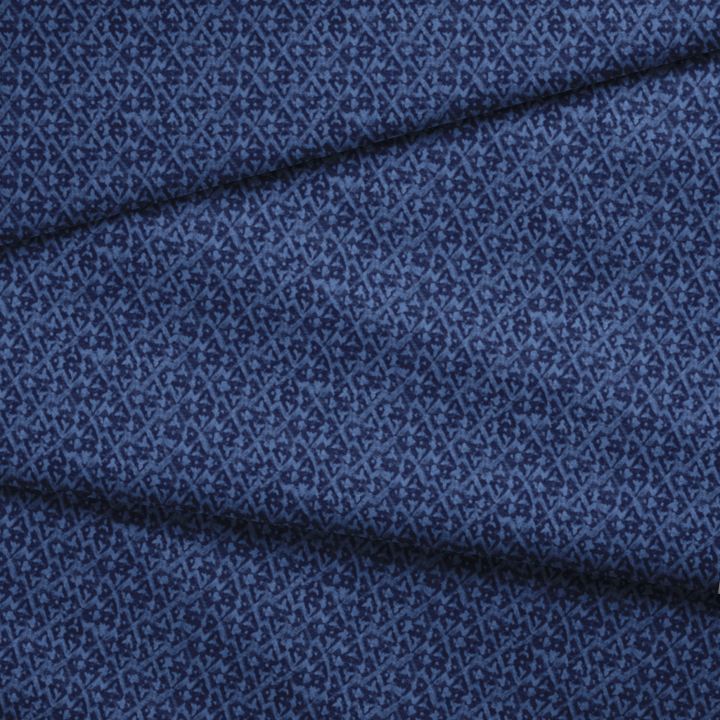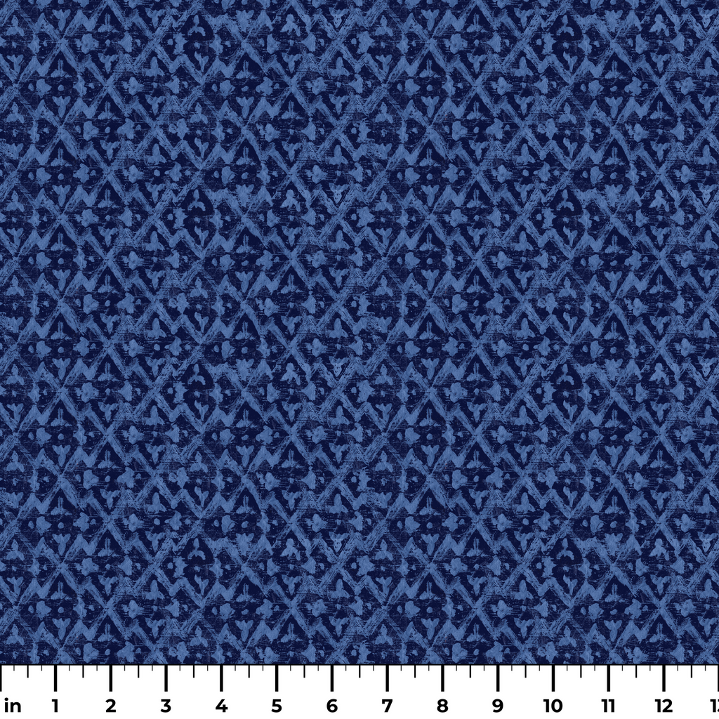 Rich indigo blues dance across this hand-crafted diamond pattern fabric, creating a stunning batik-inspired design. The brushstroke texture gives it depth and movement, with lighter cornflower blue markings against a navy background forming geometric shapes with an organic, artisanal feel. Perfect for statement throw pillows or a striking quilting project that showcases your artistic flair.