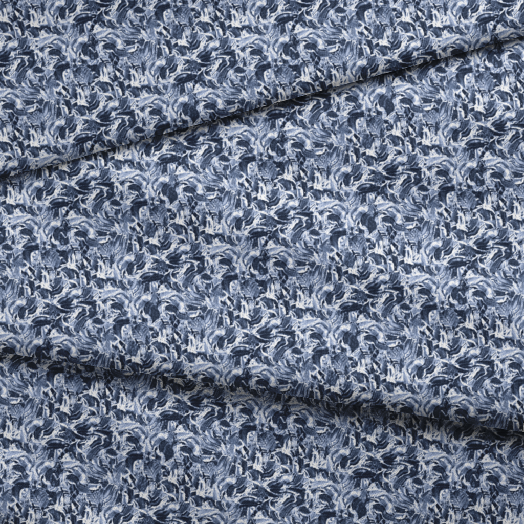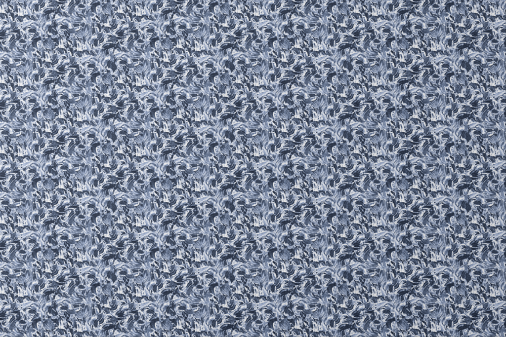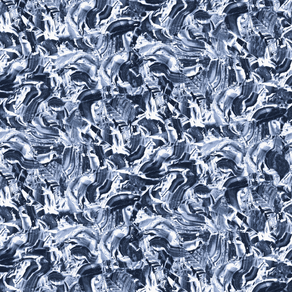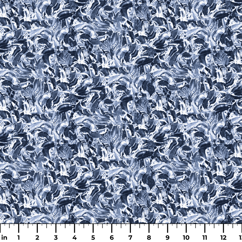 Dynamic brushstrokes of navy and white dance across this fabric in a mesmerizing marble-like pattern. The abstract swirls and textured paint effect create depth and movement, reminiscent of churning ocean waves or windswept winter skies. This striking monochromatic design would make a stunning statement piece for home décor projects like throw pillows or dramatic curtains, and adds sophisticated flair to handbags or structured jackets.