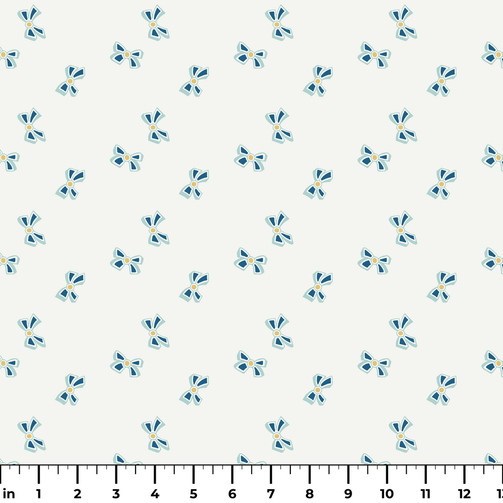 Elegant blue and yellow bow pattern ain contemporary style on a cream background, perfect for modern home decor and apparel projects.