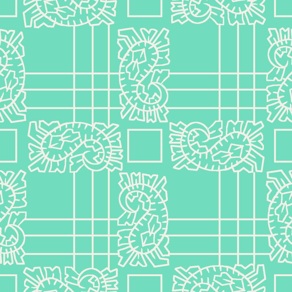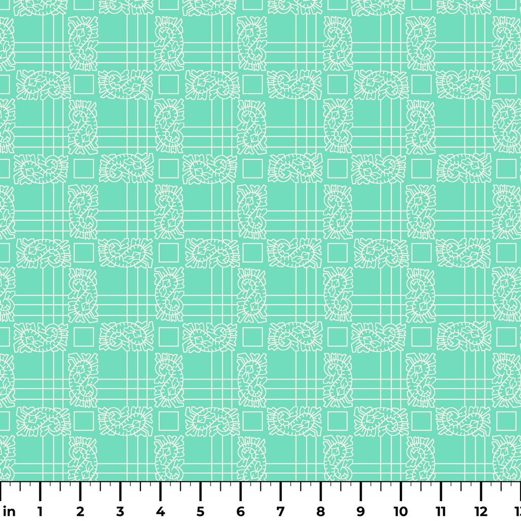 Fresh mint green background with intricate white line work creates a contemporary geometric pattern of plaid and organic paisley shapes for a modern, playful aesthetic.