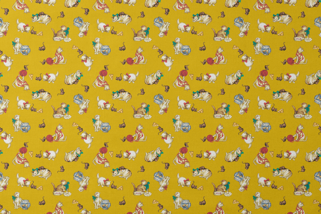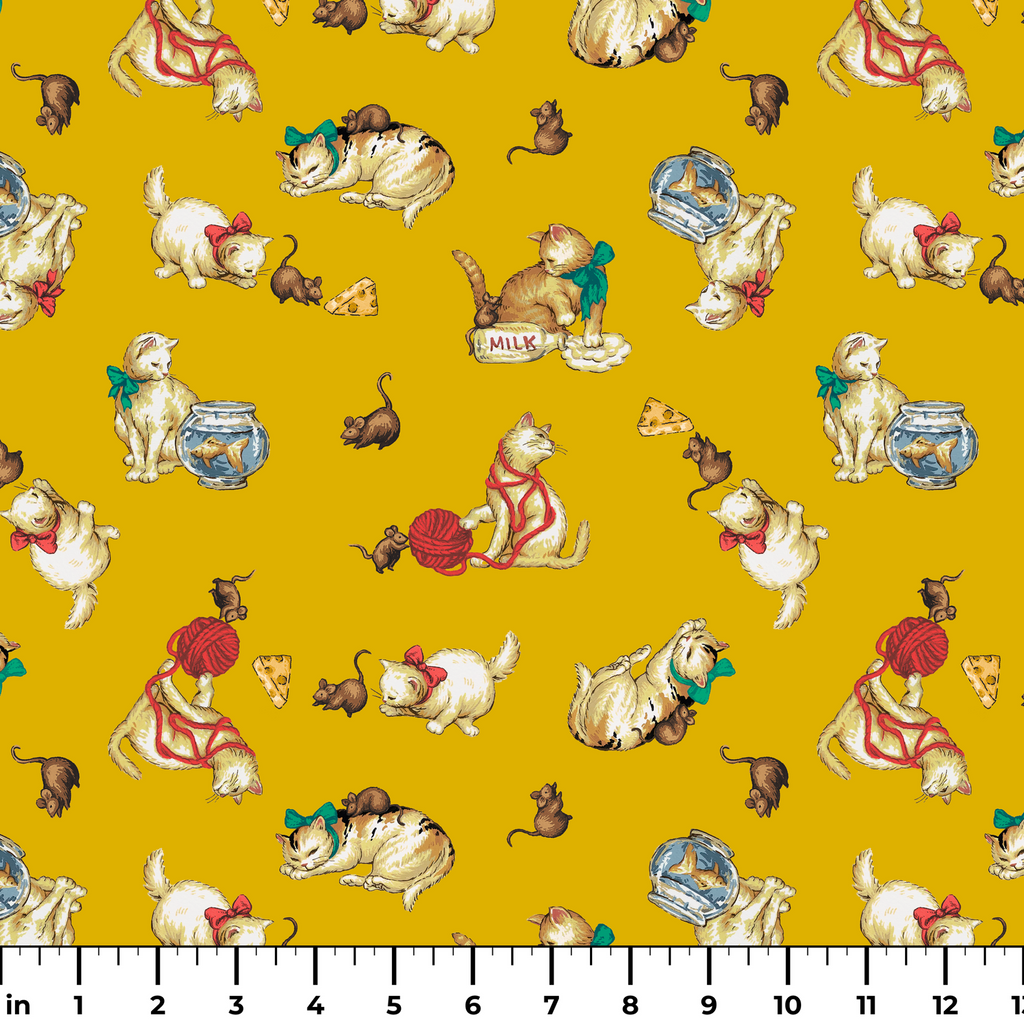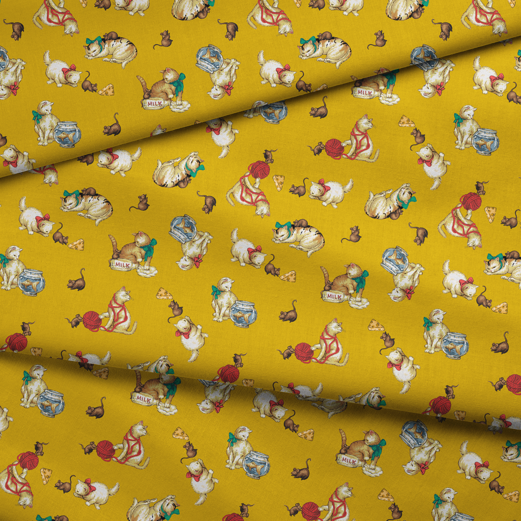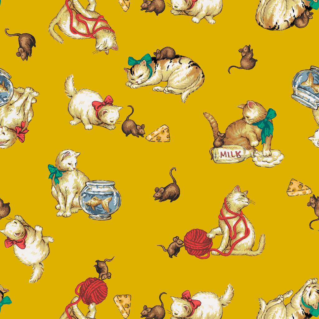 Vintage-inspired golden yellow pattern featuring playful cats with milk bowls, retro kittens, and whimsical feline illustrations in a charming all-over repeat pattern.