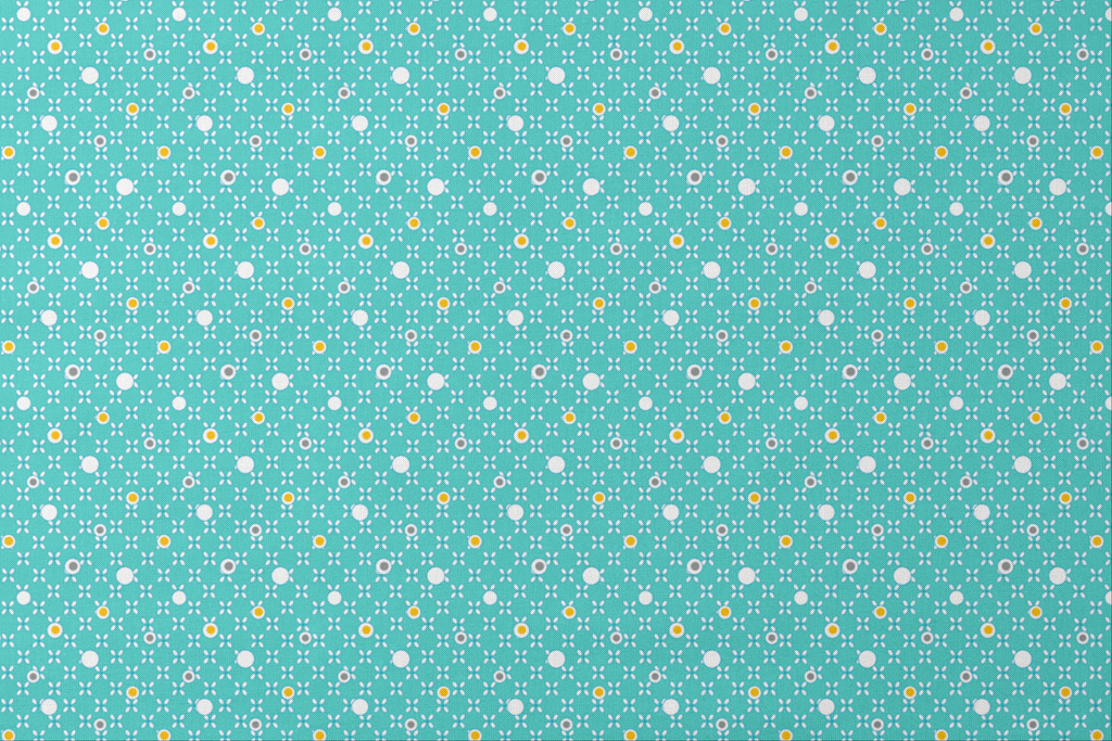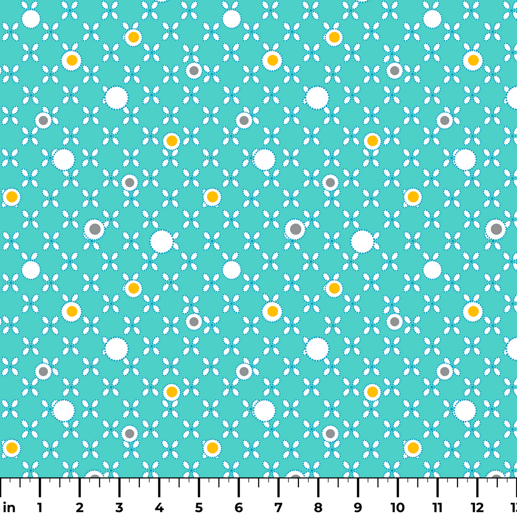 Cheerful dotted flowers dance across a refreshing aqua background, creating a modern yet nostalgic pattern. White petal-like shapes surround playful circles in mustard yellow, soft gray, and crisp white, giving this fabric a sunny, retro-inspired charm. This delightful print would breathe life into kitchen accessories like aprons and pot holders, or add a whimsical touch to children's room décor.