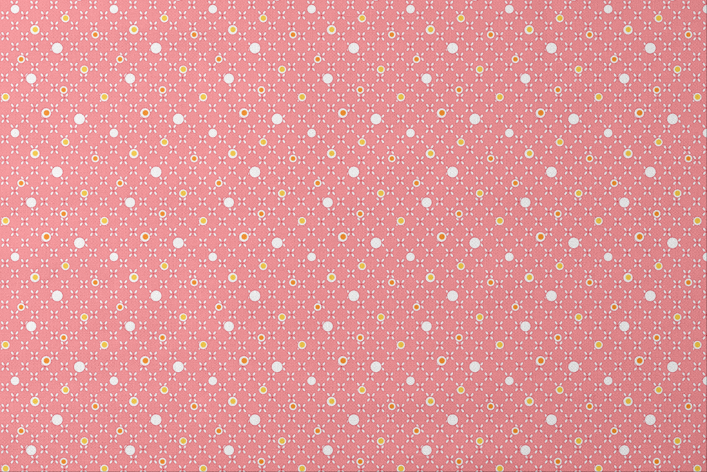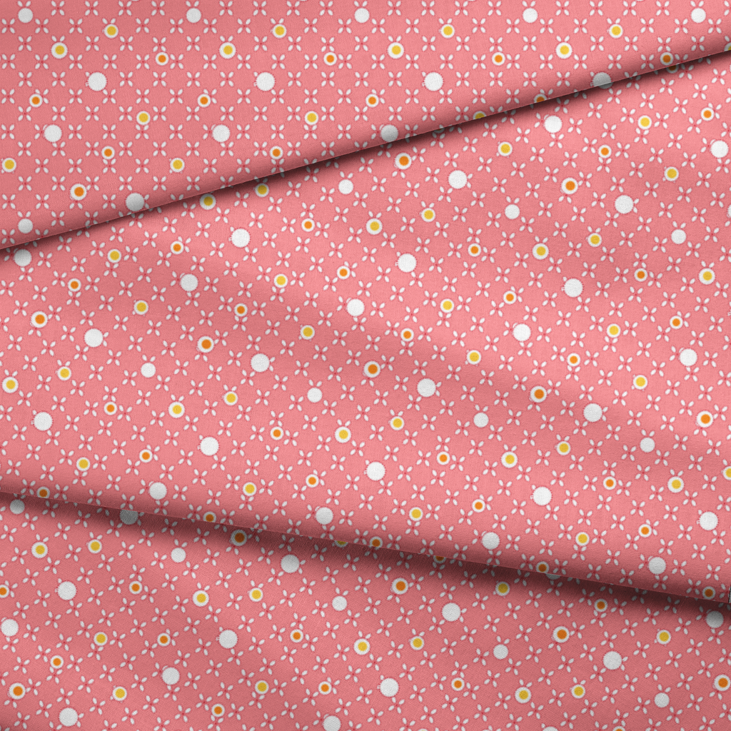 Delightful dotted flower motifs dance across a pink background, creating a cheerful retro-inspired pattern. White scalloped petals surround playful dots in sunshine yellow, bright orange, and crisp white. This sweet fabric would make adorable summer dresses or bright, cheery kitchen accessories that bring a splash of vintage charm to your space.