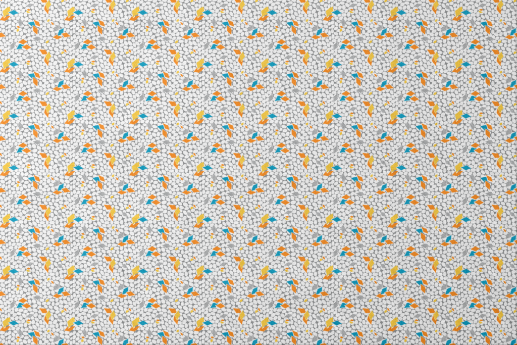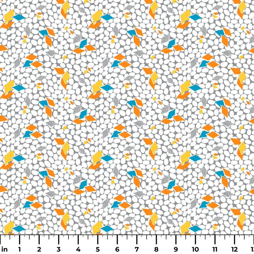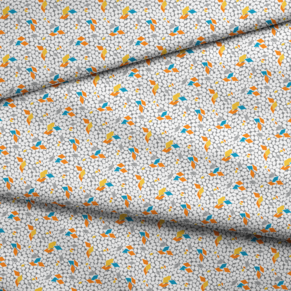 White oval pebbles scatter across a cool gray backdrop, interspersed with geometric diamond shapes in vibrant orange, sunny yellow, and teal blue. Some diamonds feature playful gray polka dots, adding an unexpected twist to this modern, abstract design. Perfect for breathable kitchen curtains or a whimsical nursery quilt that brings a splash of joy to any space.
