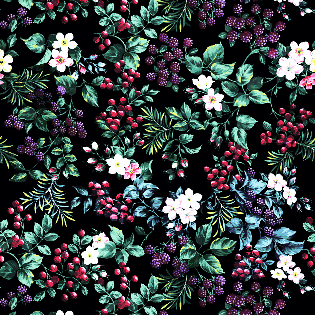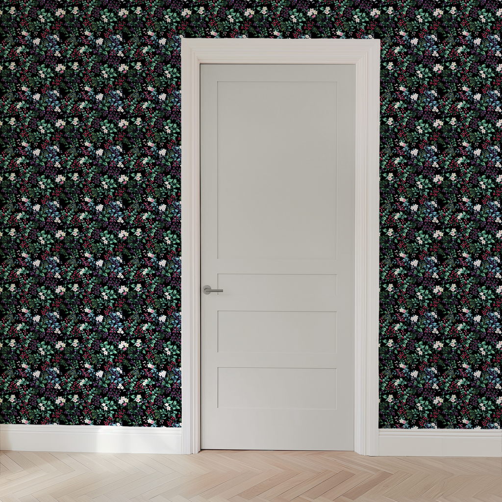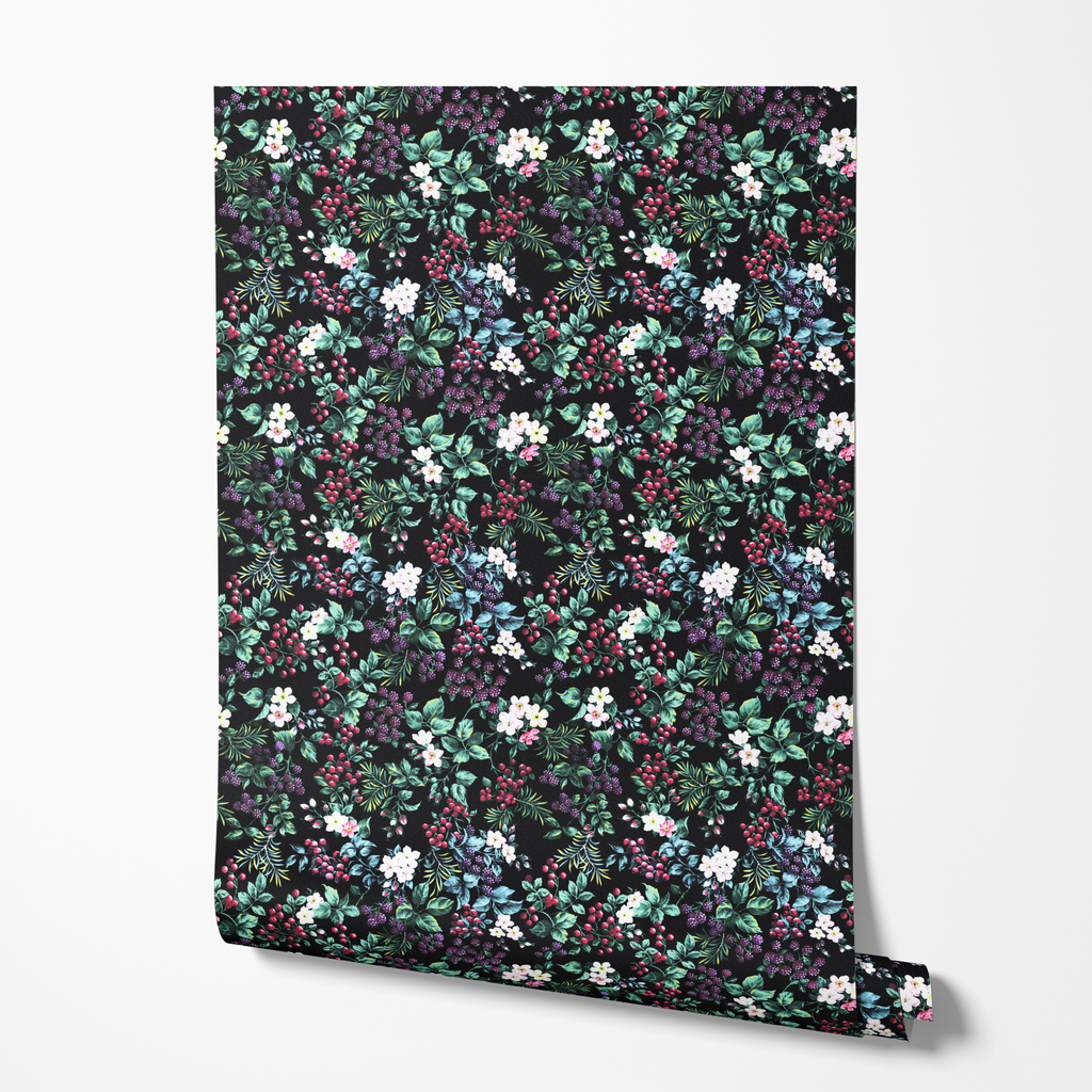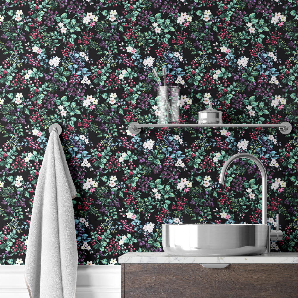 Vintage botanical featuring vibrant berries and wildflowers in rich hues of green, purple, and red on a dramatic black background - perfect for retro maximalist spaces.