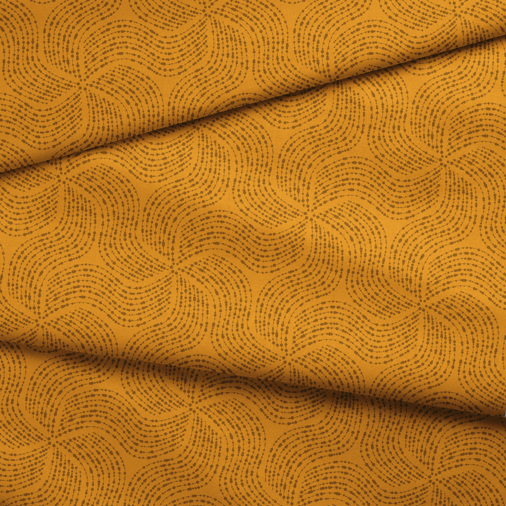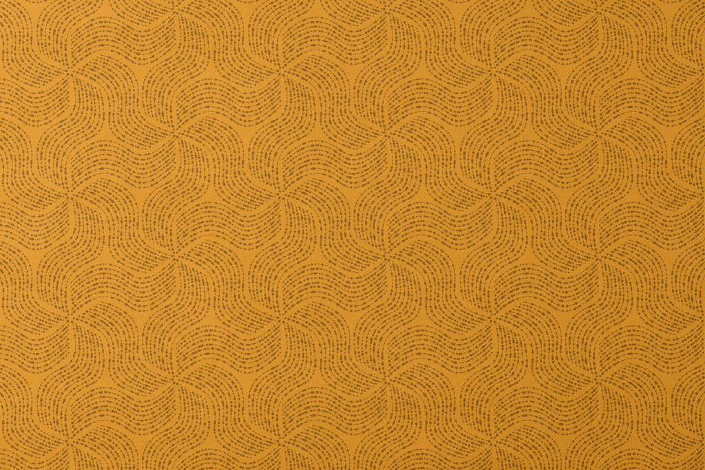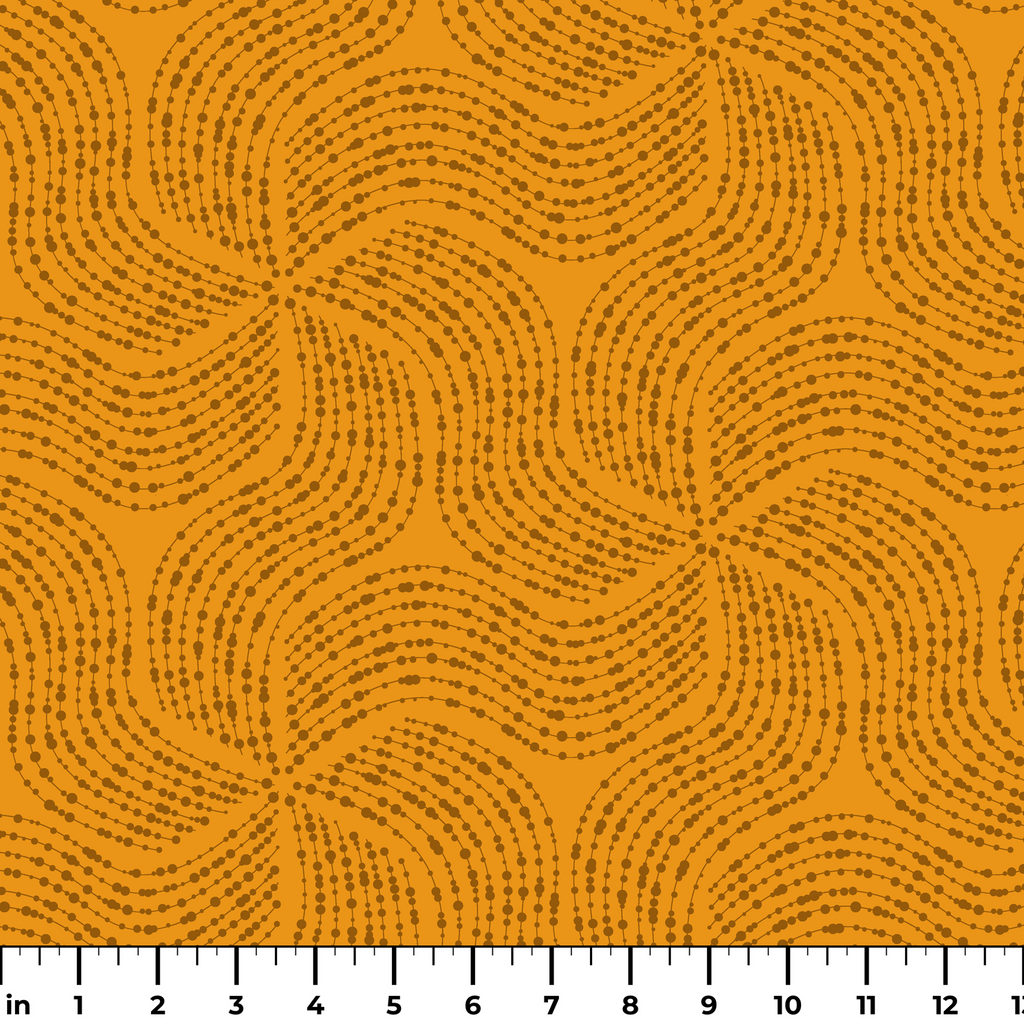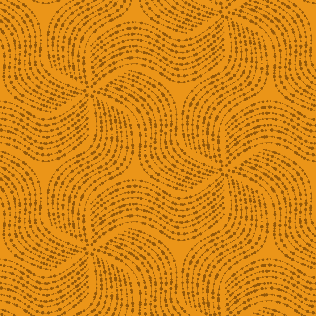 Retro orange geometric pattern featuring flowing curved dotted lines creating a groovy 70s-inspired swirl design with mid-century modern abstract waves.