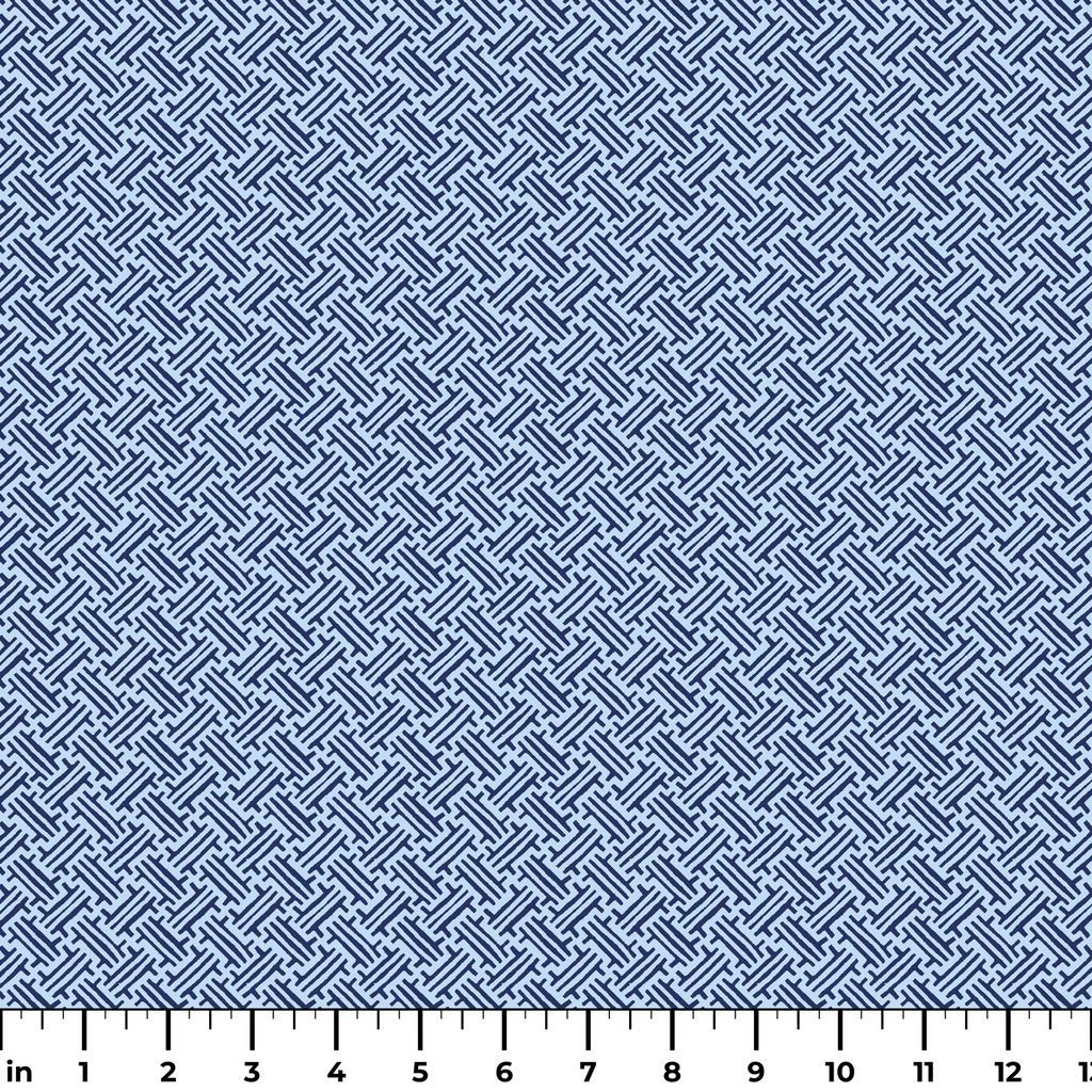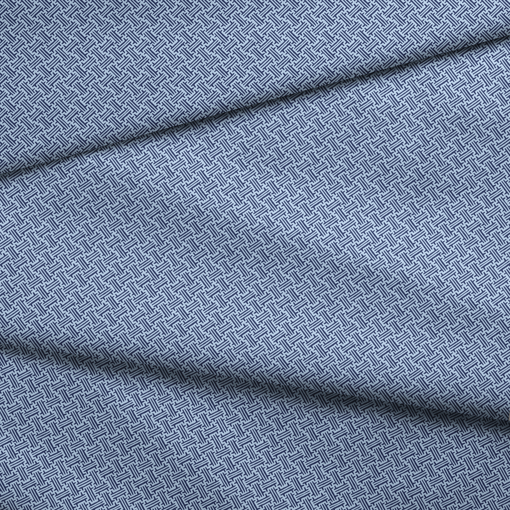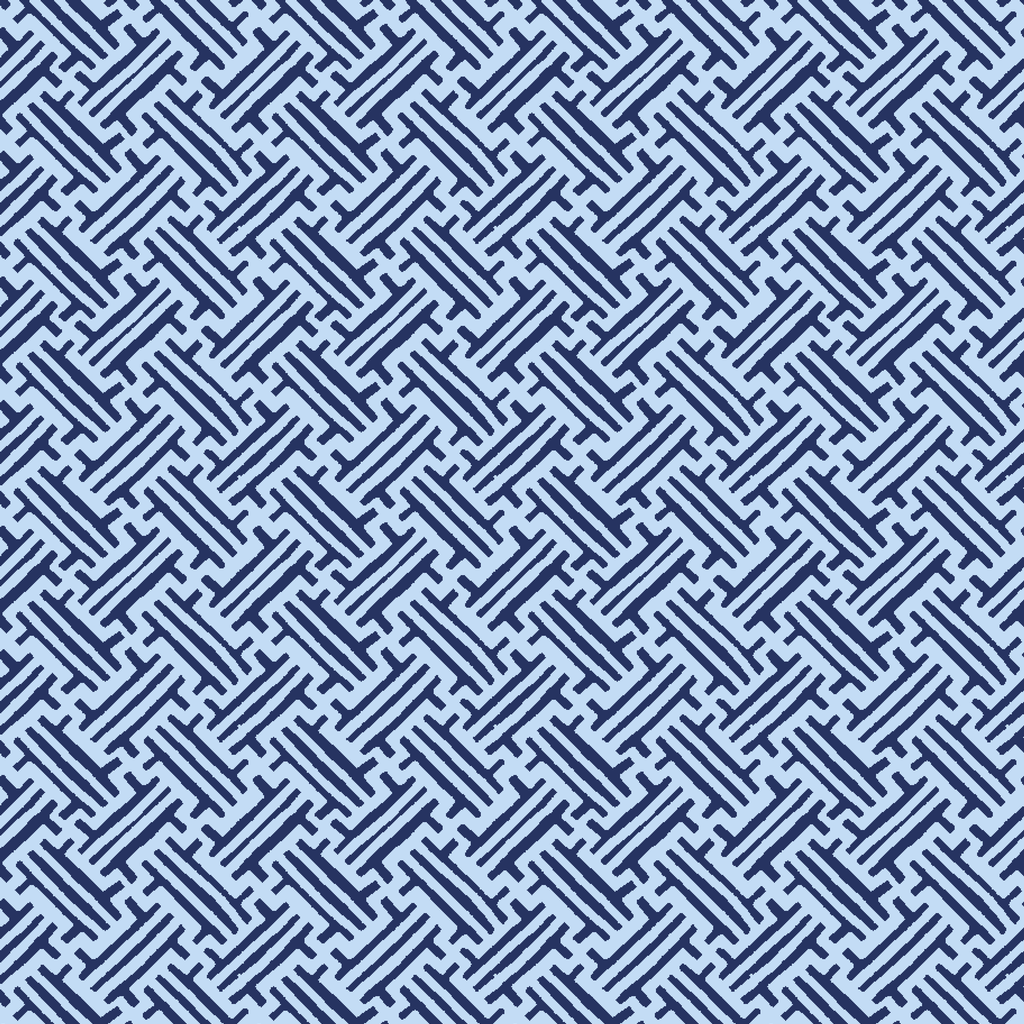 This elegant navy blue and white geometric pattern features an interlocking basketweave design, creating a classic yet modern look perfect for home decor or fashion accessories.