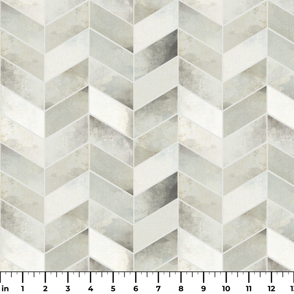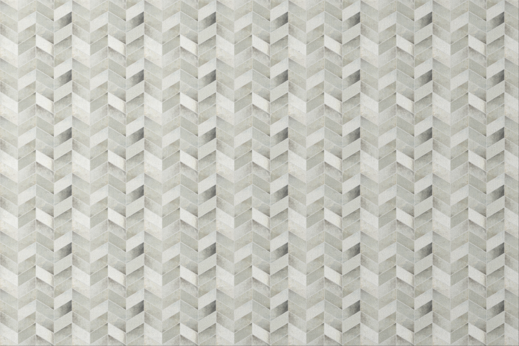 This contemporary geometric chevron design features soft gray, white, and silver tones with a subtle weathered texture, creating an elegant and sophisticated pattern perfect for modern home decor.