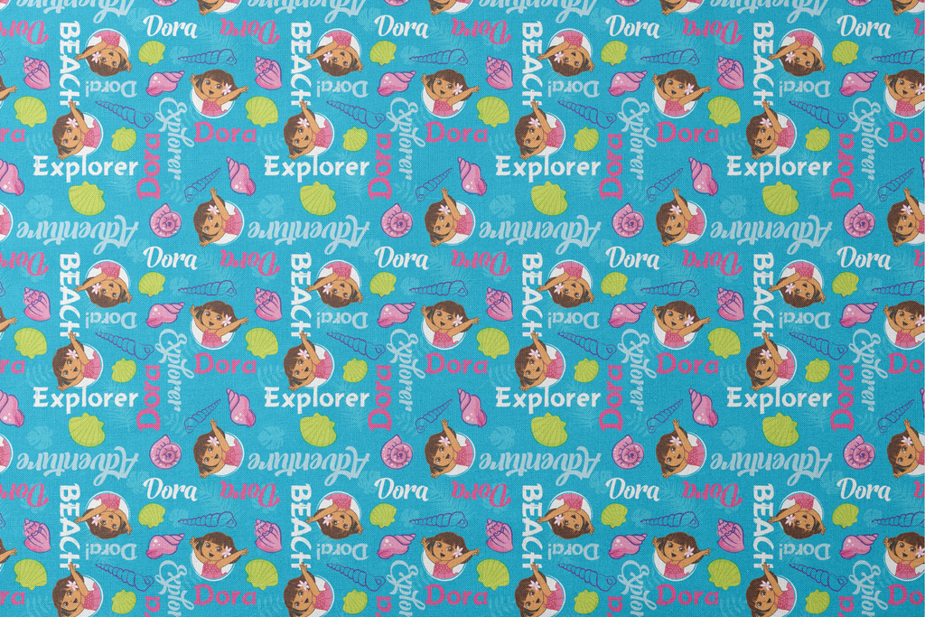 Vibrant Dora the Explorer pattern featuring the beloved cartoon character, seashells, and tropical elements on a bright turquoise background. Perfect for children's apparel and accessories.