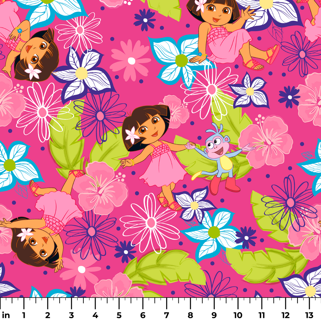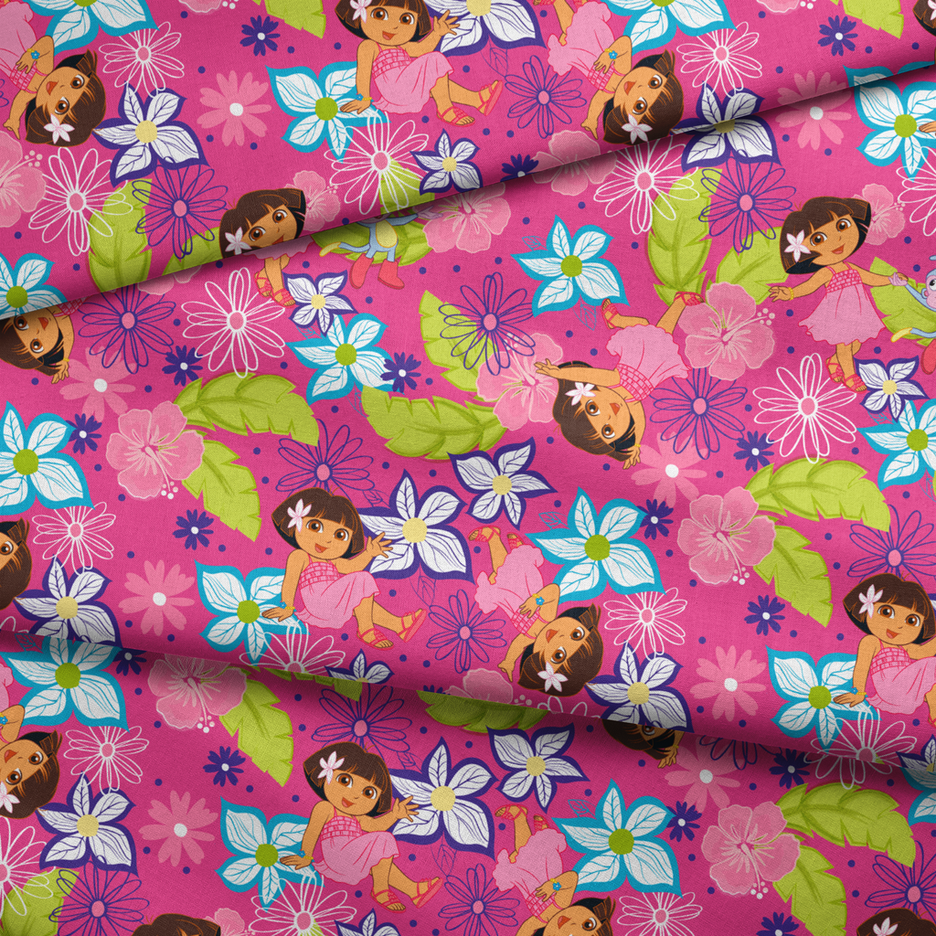 Vibrant pink floral print featuring Dora the Explorer characters among colorful blossoms, butterflies, and green leaves - perfect for children's apparel and bedroom decor.
