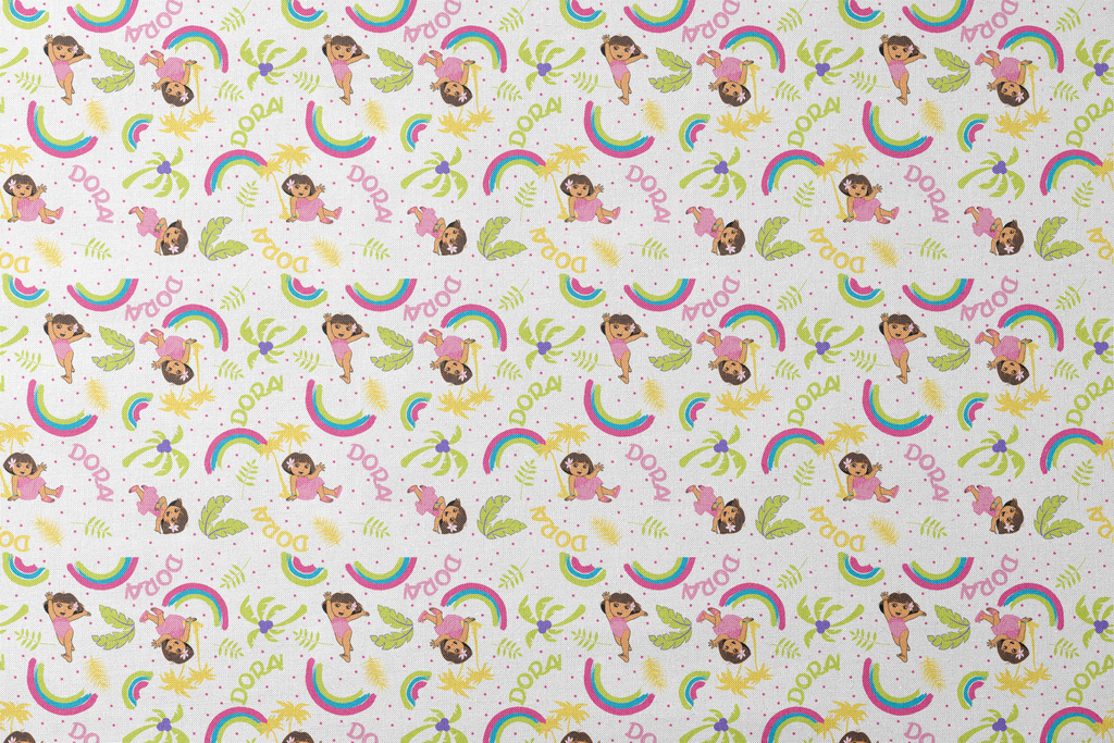 Vibrant rainbows and tropical motifs dance across this whimsical Dora the Explorer pattern. Colorful curved arcs and bright leafy elements create a playful, cheerful design perfect for kids' apparel or bedding.