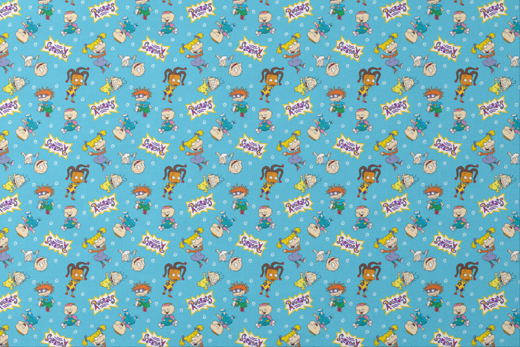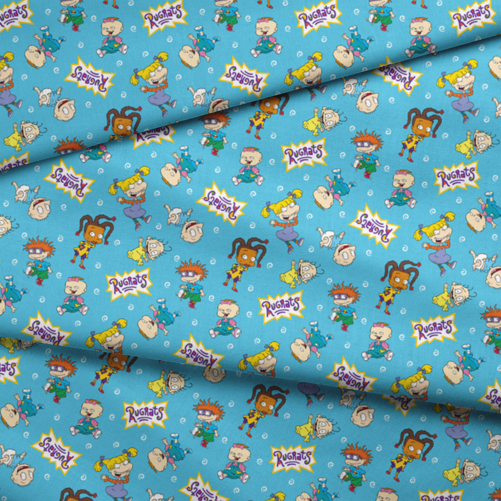 Step back into nostalgic cartoon bliss with this playful Rugrats fabric featuring Tommy, Chuckie, Angelica and the whole baby gang scattered across a bright sky blue background. The vibrant yellow Rugrats logo pops against the blue, while whimsical white swirls add movement throughout the design. Perfect for creating custom children's apparel, nursery accessories, or quirky throw pillows that'll bring a smile to any 90s kid's face.