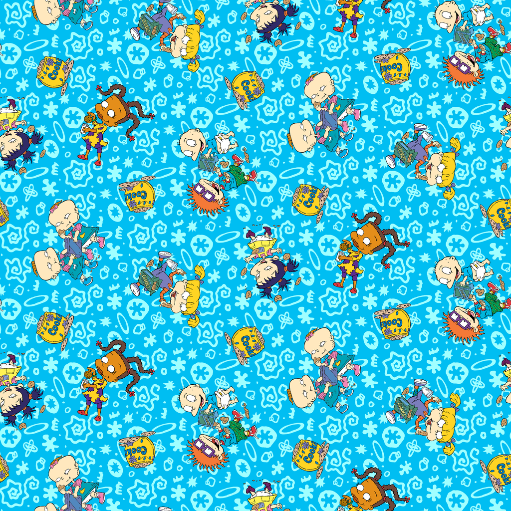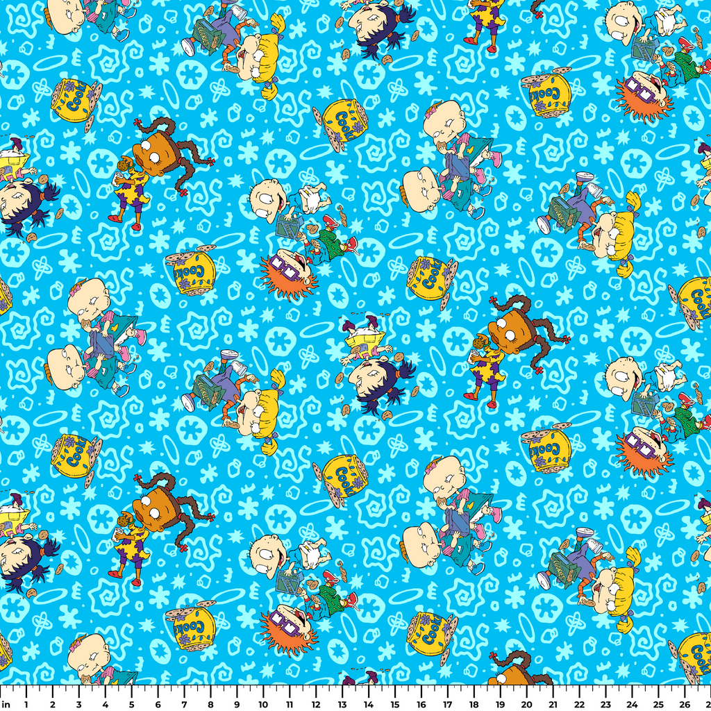 Dive into nostalgia with this vibrant Rugrats fabric featuring Tommy, Chuckie, and the gang scattered across a bright sky blue background with lighter blue squiggles and shapes. The beloved animated characters are shown in their classic playful poses, bringing all the 90s cartoon charm to your sewing projects. Perfect for creating children's apparel, nursery accessories, or quirky throw pillows that will delight fans both young and those young at heart.