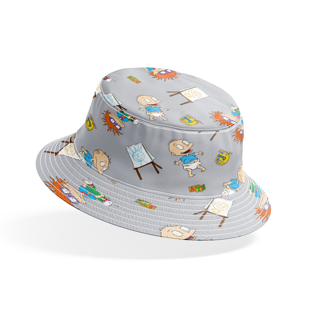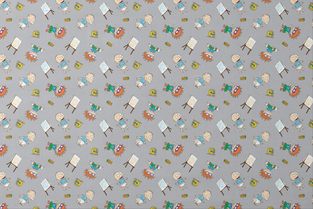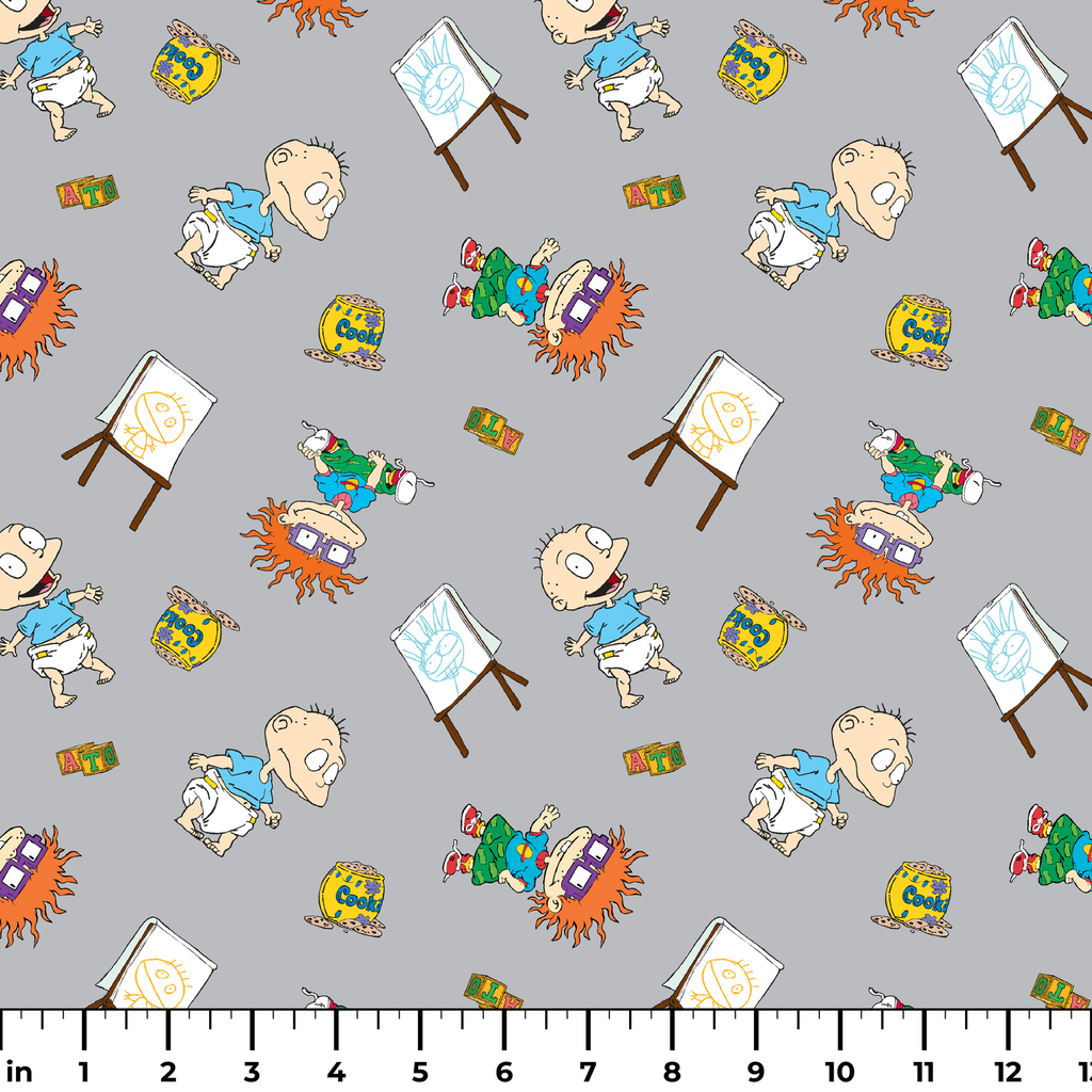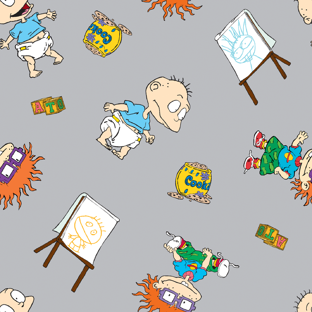 This nostalgic Rugrats fabric features Tommy, Chuckie, and their toddler adventures scattered across a soft gray background. Colorful elements from the beloved cartoon, including cookie jars, alphabet blocks, and children's drawings on easels, create a playful rhythm throughout the design. Perfect for creating unique children's room decor, nursery accessories, or nostalgic throw pillows that will delight '90s kids at heart.
