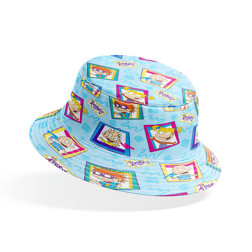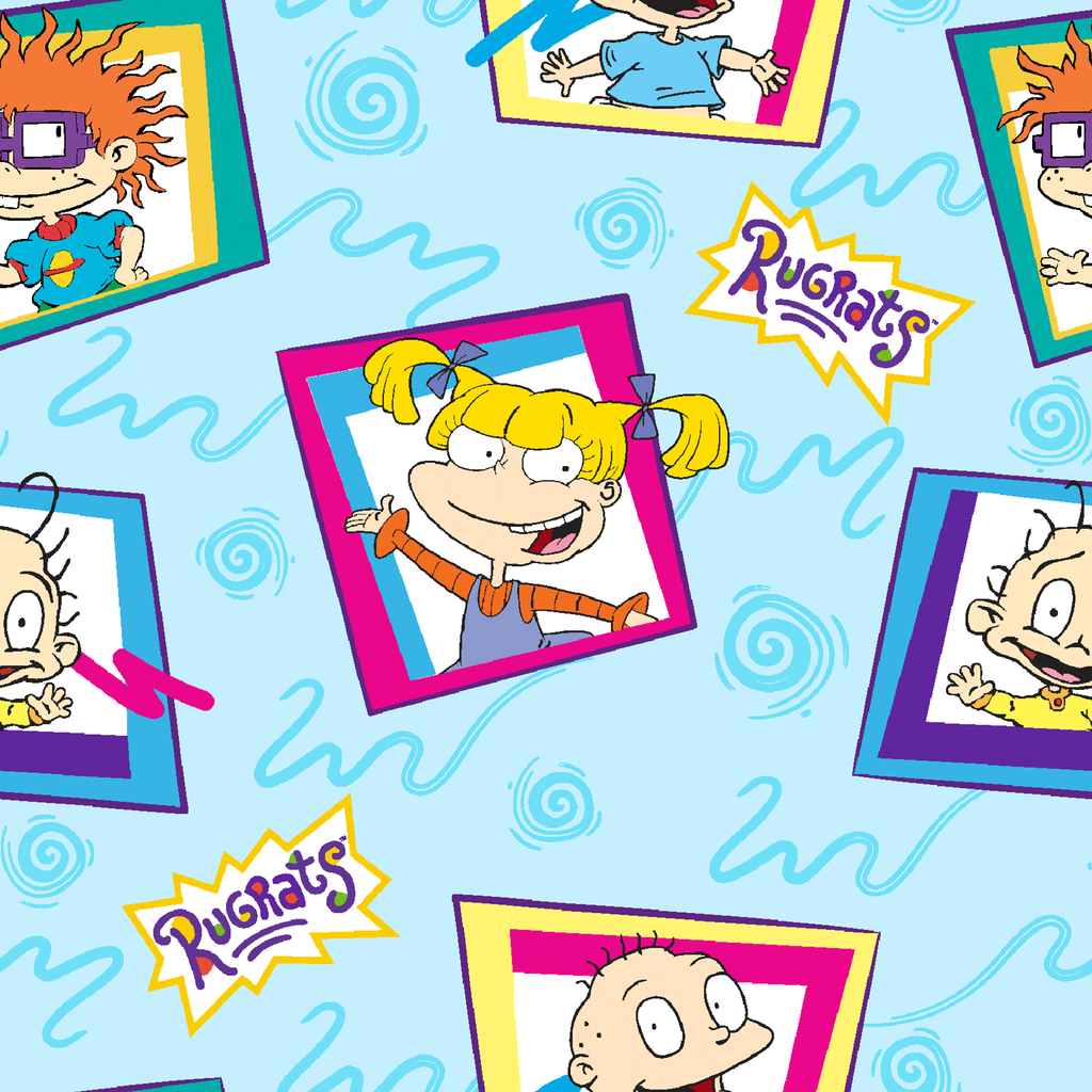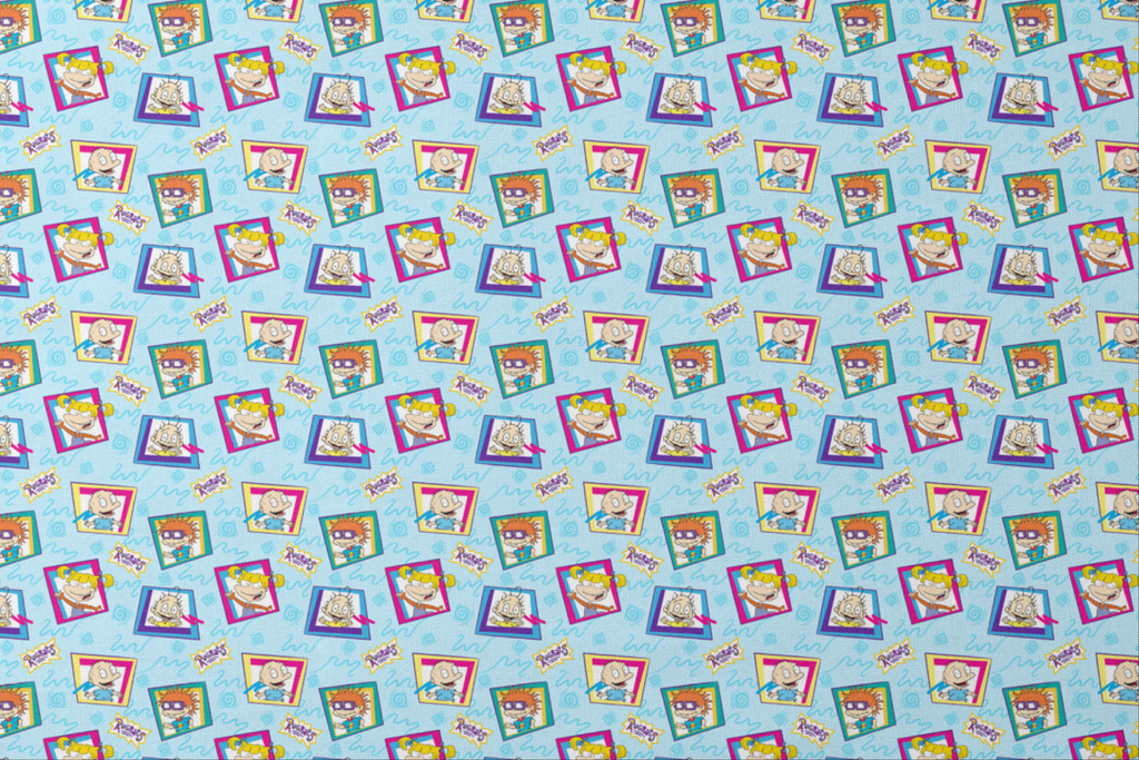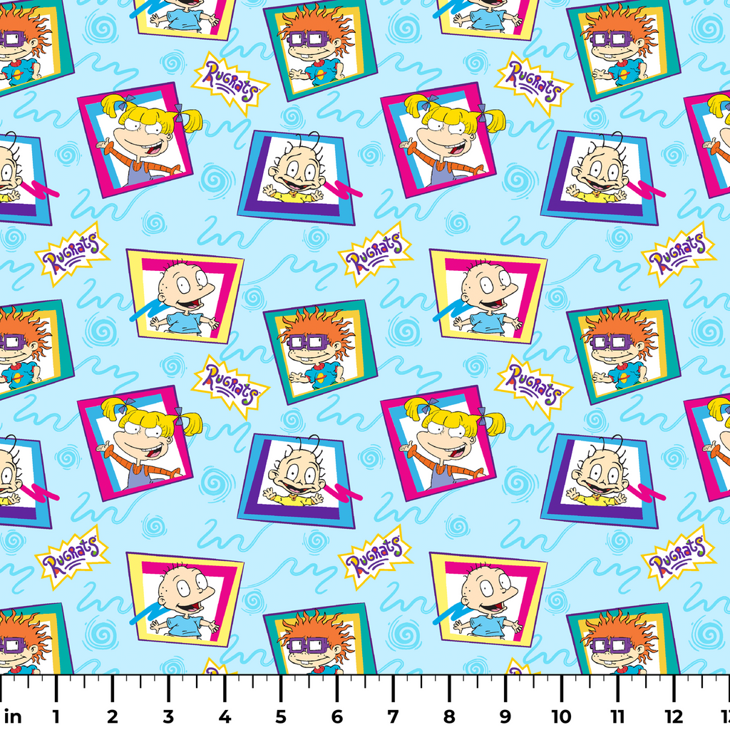 Journey back to the 90s with this nostalgic Rugrats fabric featuring beloved characters from the classic cartoon, arranged in colorful framed portraits against a soft blue background with playful swirls. The iconic characters pop with vibrant pink, purple, and yellow frames, while the signature Rugrats logo appears in bursts throughout the design. Perfect for creating children's apparel, nursery accessories, or quirky throw pillows that will delight fans both young and those who grew up with these animated adventures.