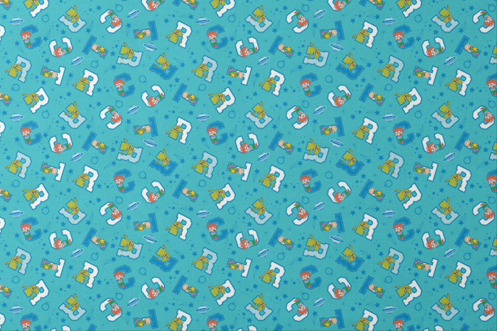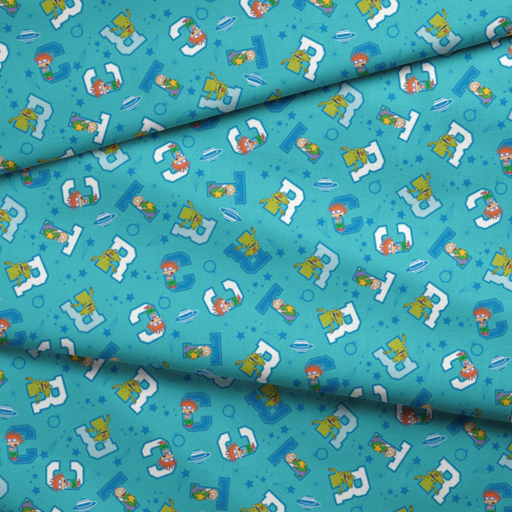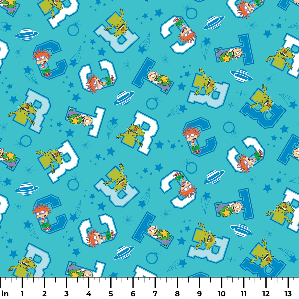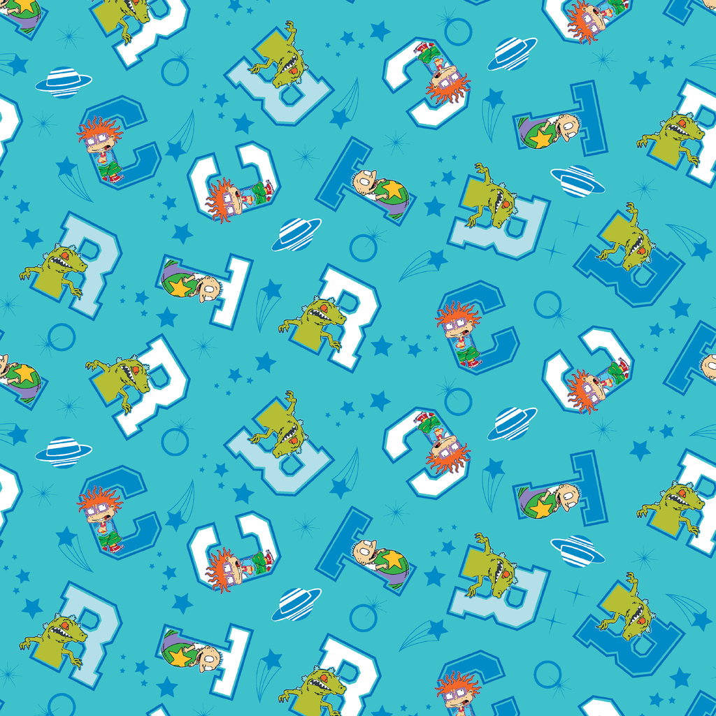 Jump into nostalgic fun with this playful Rugrats-themed fabric featuring Chuckie and Reptar on a teal blue background. The characters peek out from blocky white and blue letter shapes, surrounded by stars, swirls, and planet-like designs that create a cosmic playground feel. Perfect for creating unique children's room decor, nostalgic throw pillows, or craft projects that celebrate '90s cartoon classics.