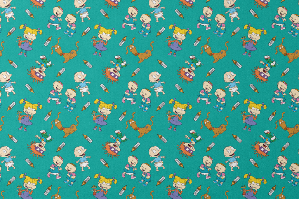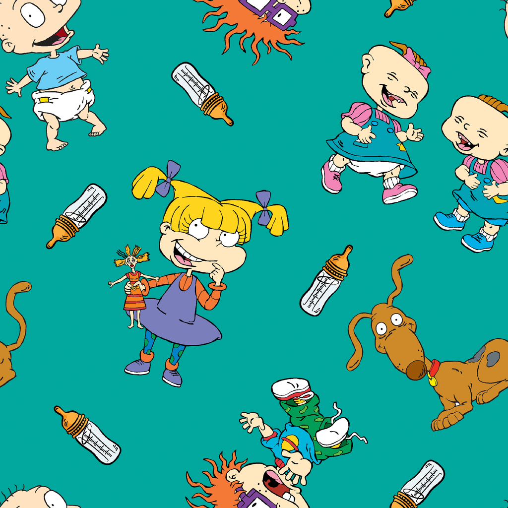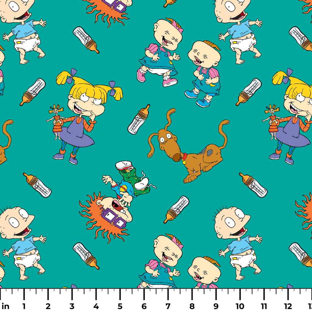 Nostalgic Rugrats characters dance across this teal background in a playful scattered pattern. The iconic Rugrats babies appear with their signature looks – pigtailed toddlers, spiky orange hair, and even their loyal dog – alongside baby bottles, creating an instantly recognizable design for 90s kids at heart. Perfect for crafting children's quilts, nursery accessories, or retro-themed pouches that bring back fond memories of Saturday morning cartoons.