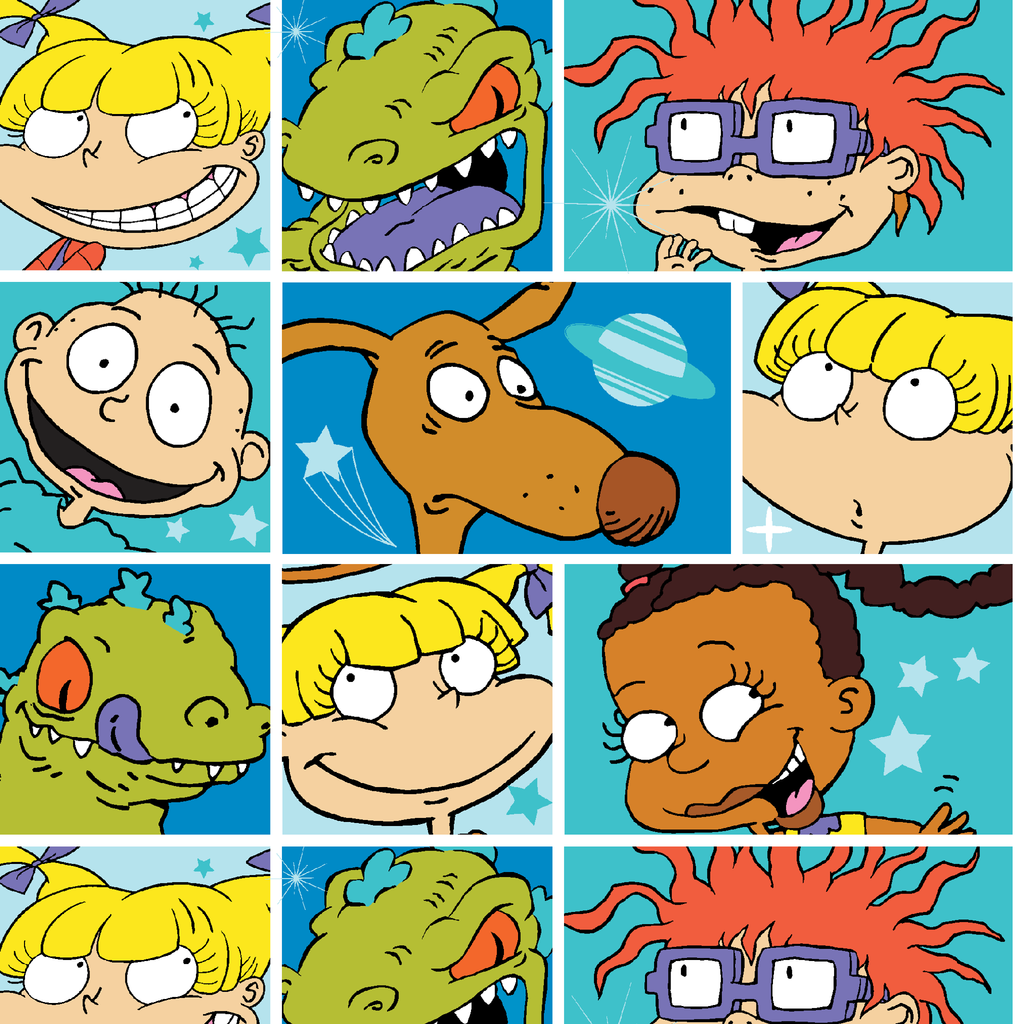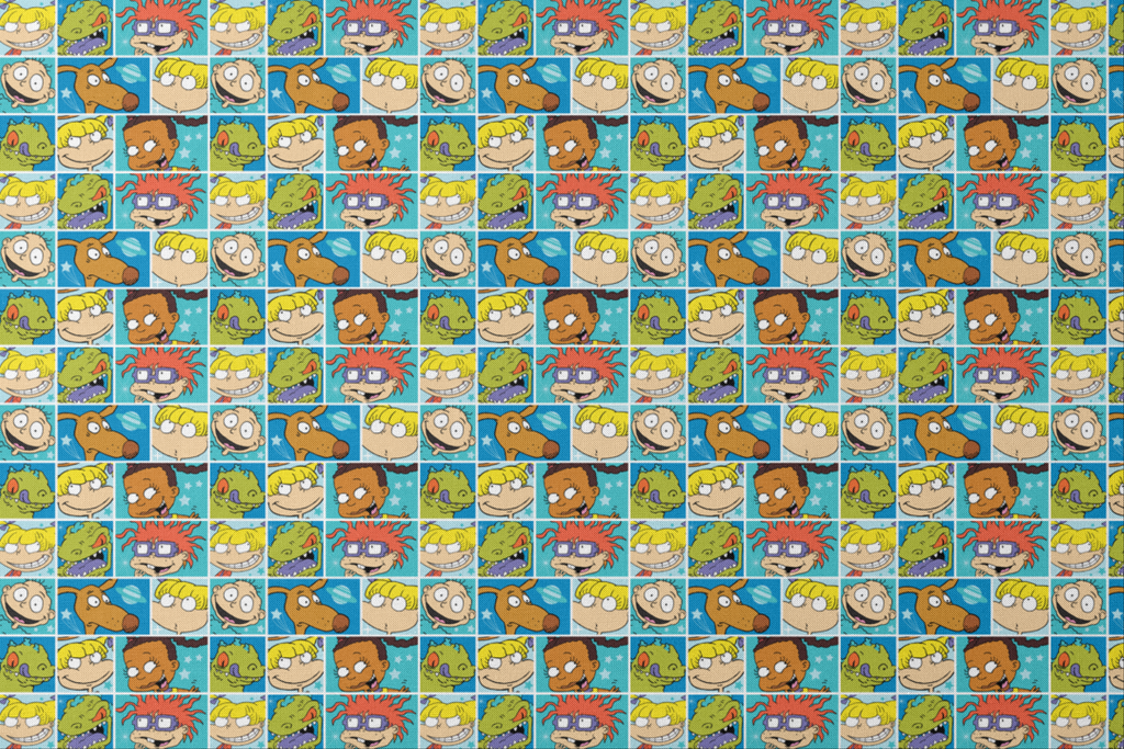 Step back in time with this nostalgic Rugrats character grid fabric featuring all your favorite characters from the beloved 90s cartoon! Bright turquoise and blue backgrounds frame colorful character portraits including Angelica, Reptar, Chuckie, and others in their classic animated style. This playful print is perfect for creating children's apparel, nursery accessories, or throwback projects that celebrate retro cartoon fandom.