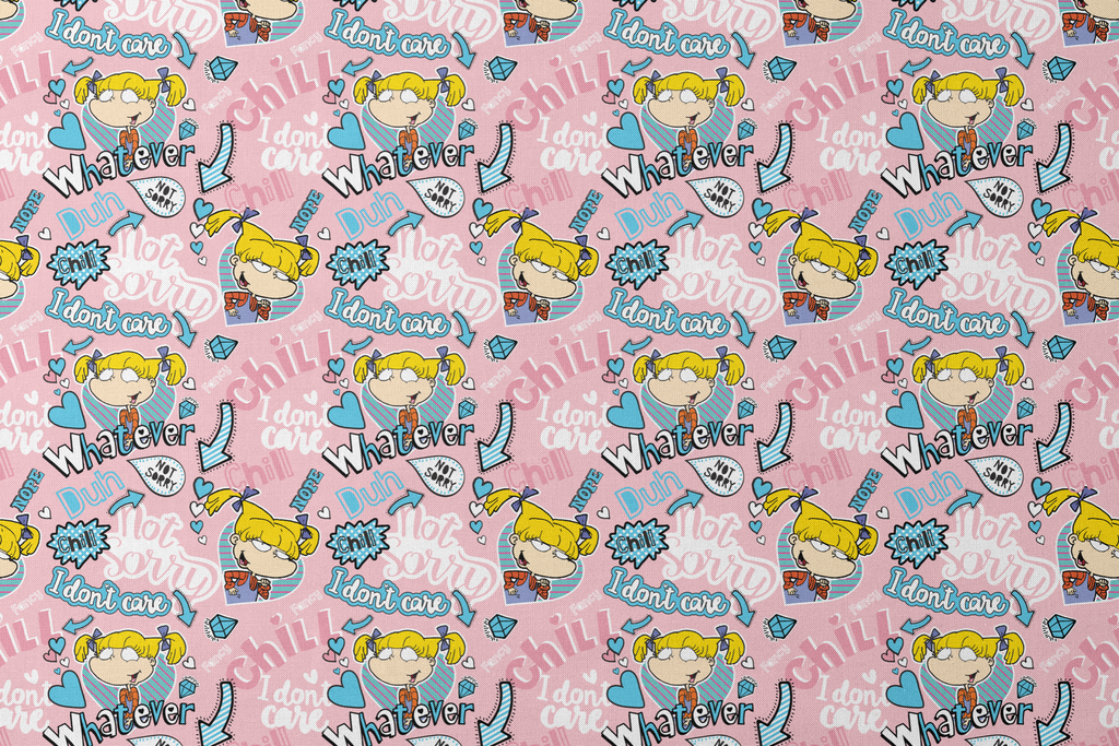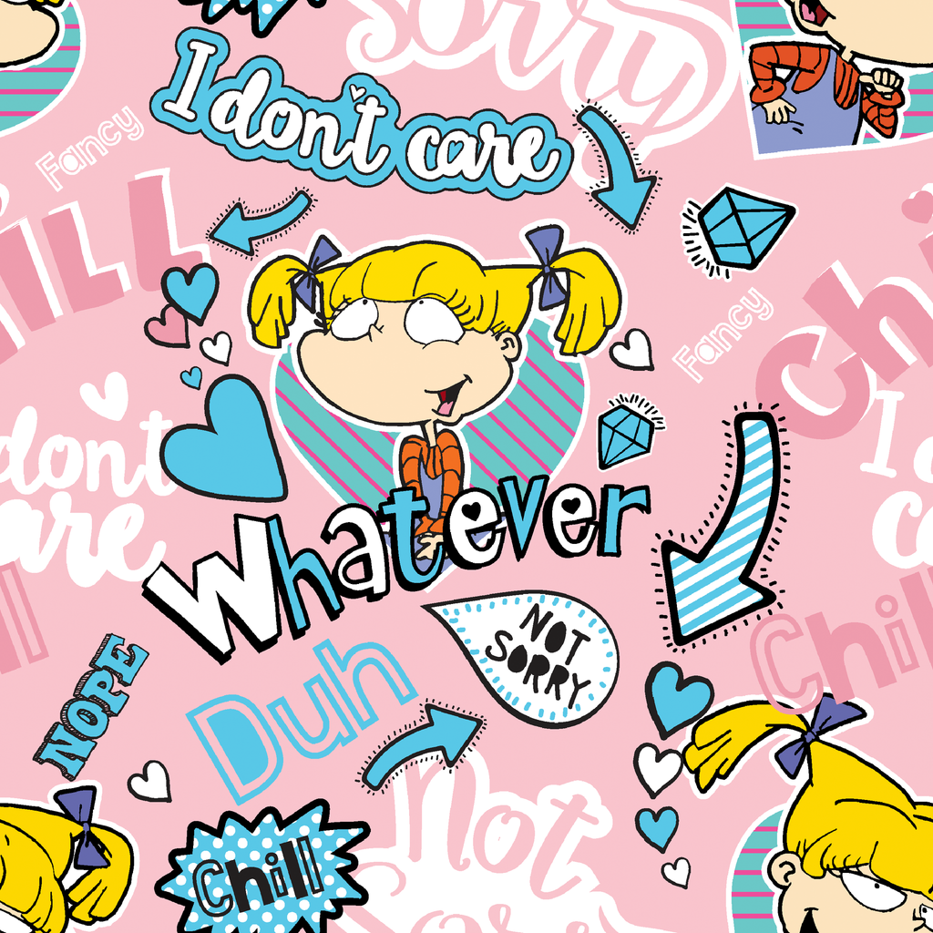 This playful Rugrats-inspired fabric features Angelica Pickles on a sweet pink background, scattered with sassy phrases like "Whatever," "I don't care," and "Not Sorry" in bold blue lettering. Cartoon hearts, diamonds, and arrows in turquoise, purple, and yellow add to the nostalgic '90s vibe, creating a perfect blend of attitude and charm. This fabric would be fantastic for tote bags, pillow covers, or quirky face masks that celebrate retro cartoon cool.