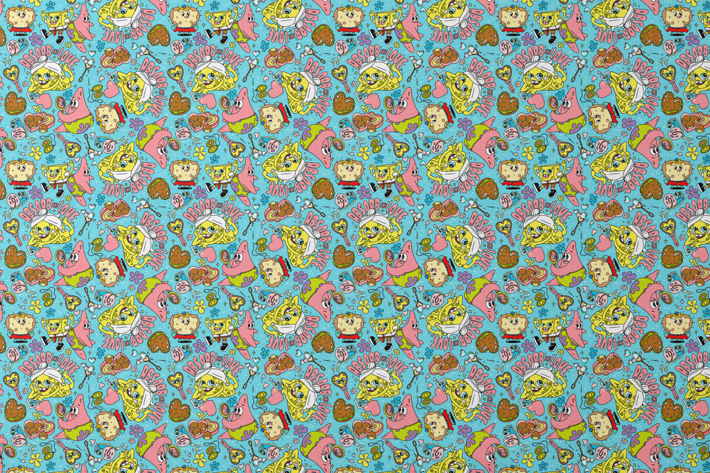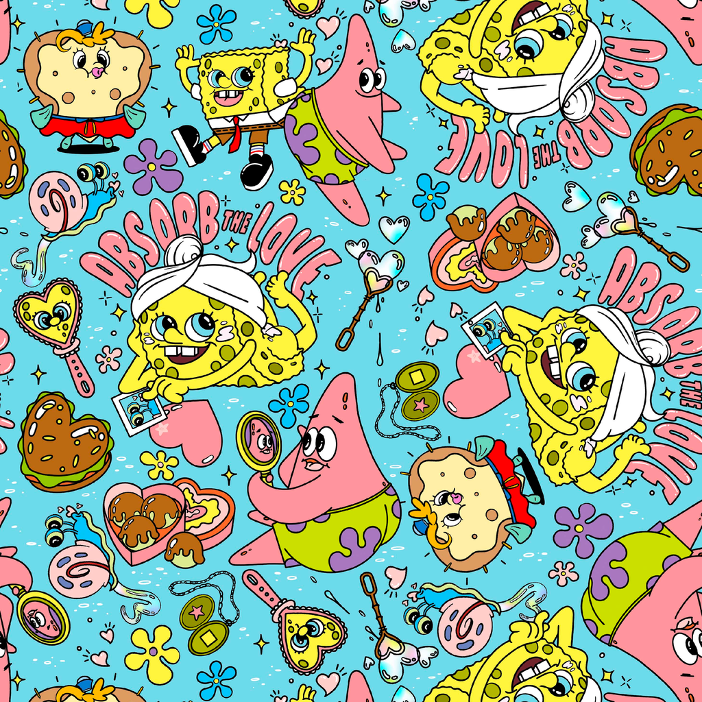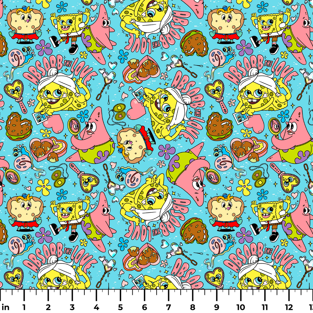 Colorful Nickelodeon SpongeBob SquarePants and Patrick Star pattern featuring the beloved Bikini Bottom characters in a fun, vibrant cartoon style with text of "Absorb the Love". Perfect for fans of the classic Nickelodeon series.