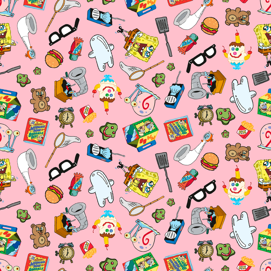 Nostalgic 90s Nickelodeon SpongeBob and retro icons scattered on a bright pink background. Perfect for crafting projects.