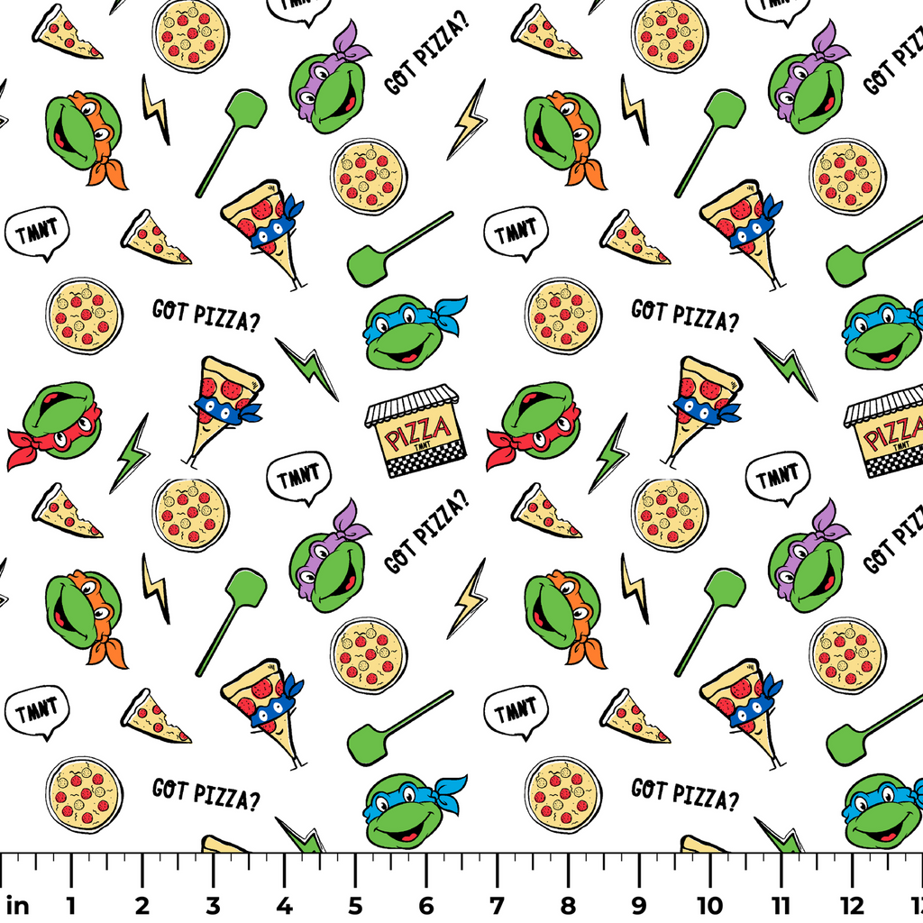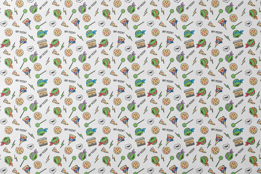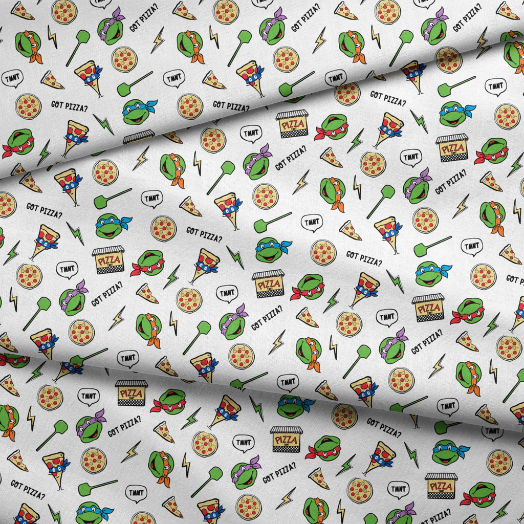 Playful TMNT-inspired pizza pattern featuring the iconic characters with colorful bandanas, scattered pizza slices, yellow lightning bolts, and fun text bubbles saying "GOT PIZZA?" and "TMNT" on a white background.