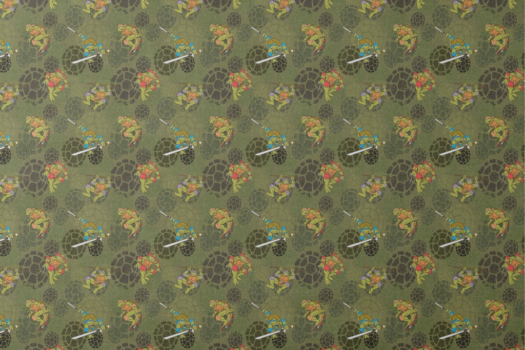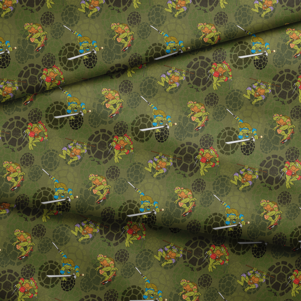 Vibrant green TMNT pattern with the action-packed turtle heroes wielding weapons against a turtle shell background. Perfect for fans of the classic cartoon series and retro 90s nostalgia.