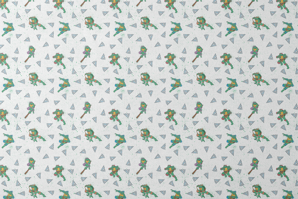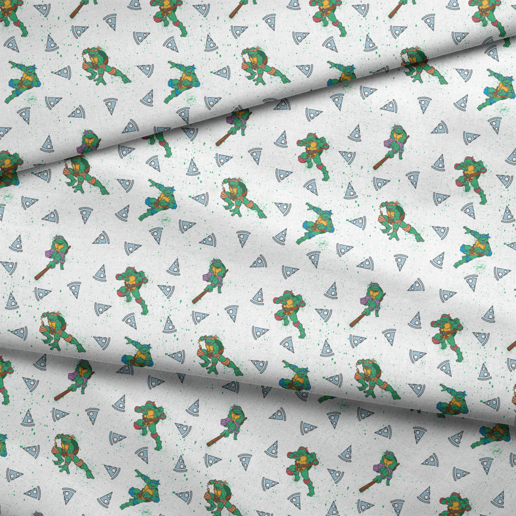 This fun, retro pattern features Teenage Mutant Ninja Turtles in action poses surrounded by scattered pizza slices on a speckled white background - perfect for fans of 90s nostalgia and TMNT lovers!