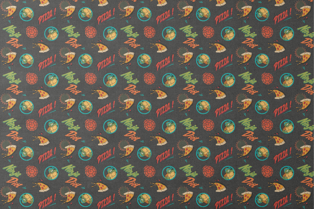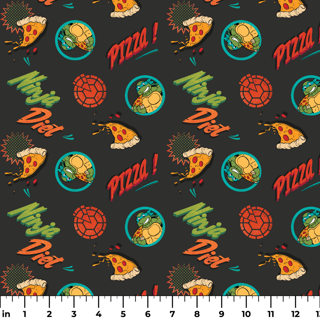 TMNT-inspired retro pizza design featuring the iconic characters, bold red text, pizza, and comic-style graphics on a dark background - perfect for lovers of the series and 90s nostalgia.