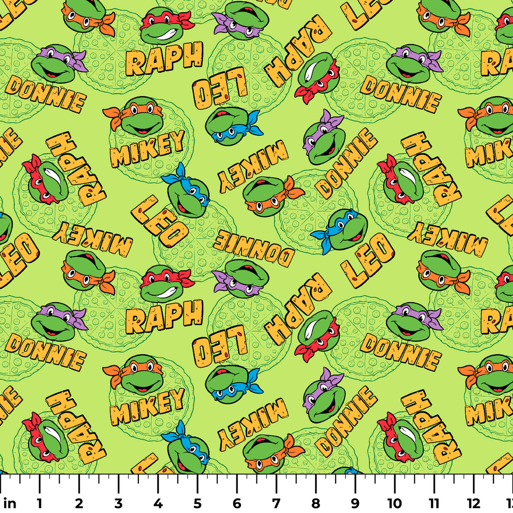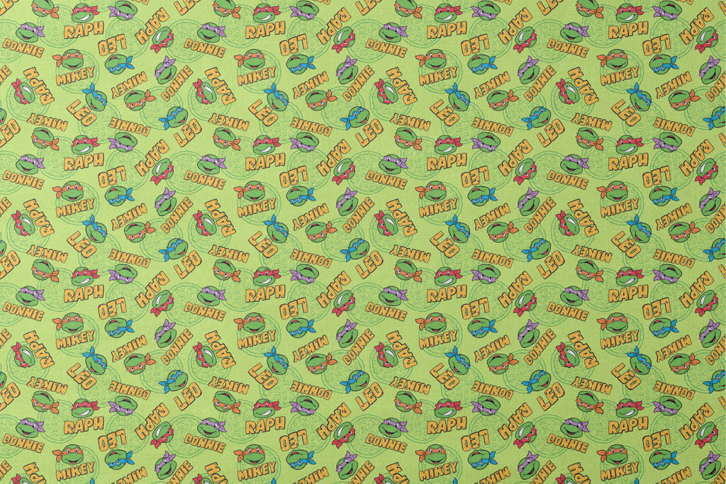 This vibrant green design features the Teenage Mutant Ninja Turtles with colorful masks in red, blue, orange, and purple, alongside character names like Raph, Leo, Mikey, and Donnie, perfect for Teenage Mutant Ninja Turtles fans.