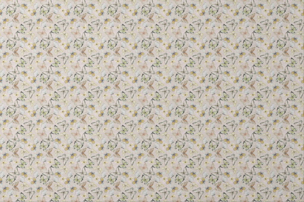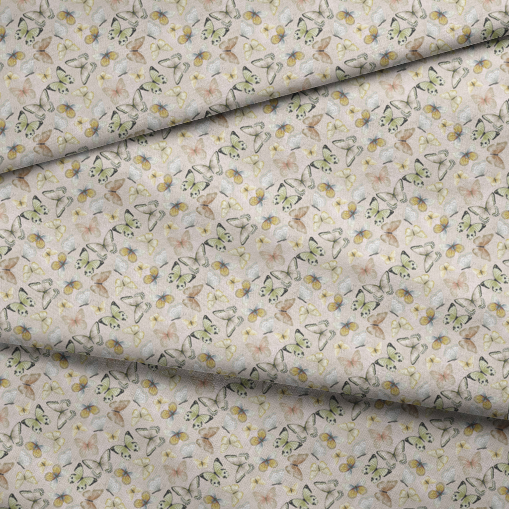Delicate butterflies in soft pastel hues flutter across this elegant design, featuring shades of yellow, green, white and brown on a subtle blush background.