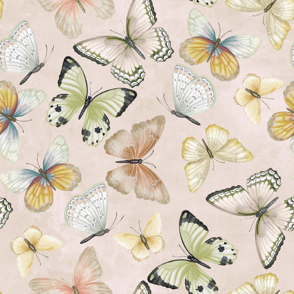 Delicate butterflies in soft pastel hues flutter across this elegant design, featuring shades of yellow, green, white and brown on a subtle blush background.