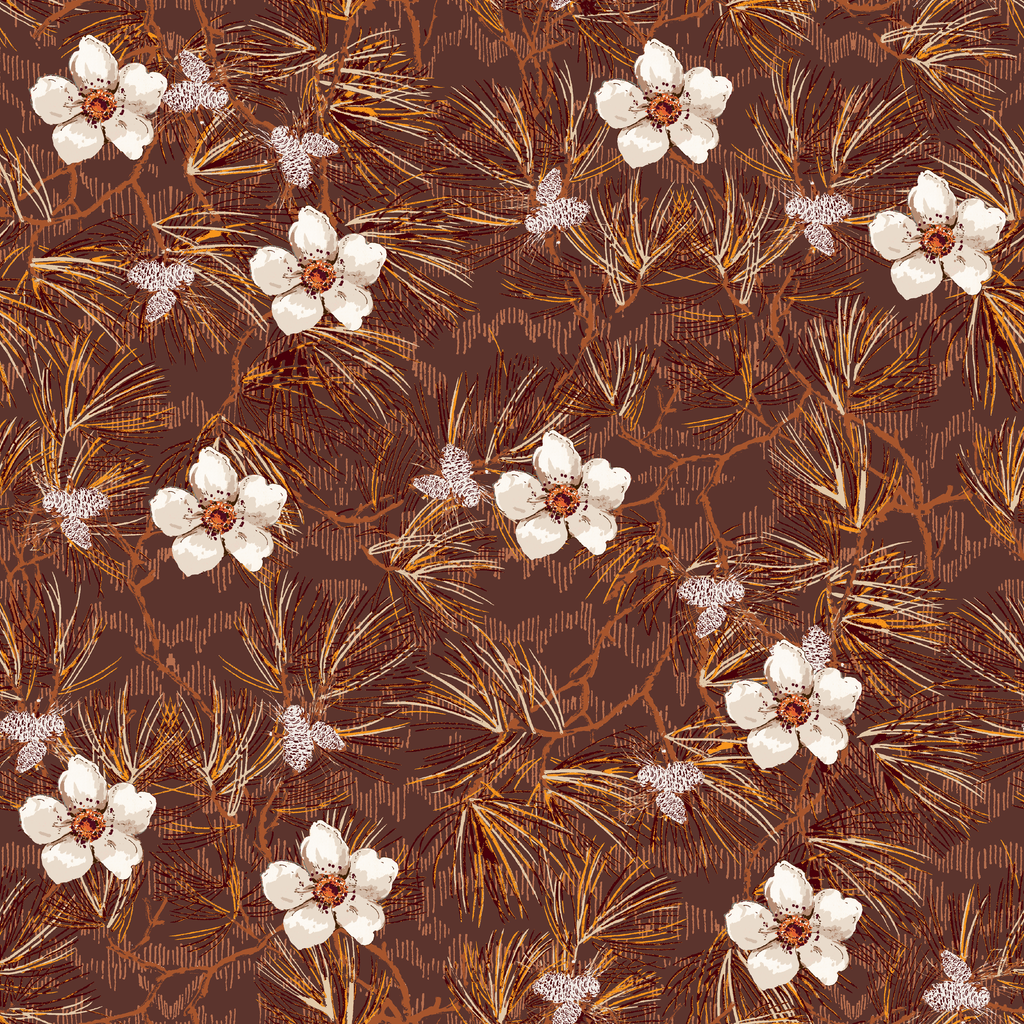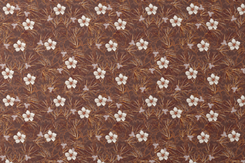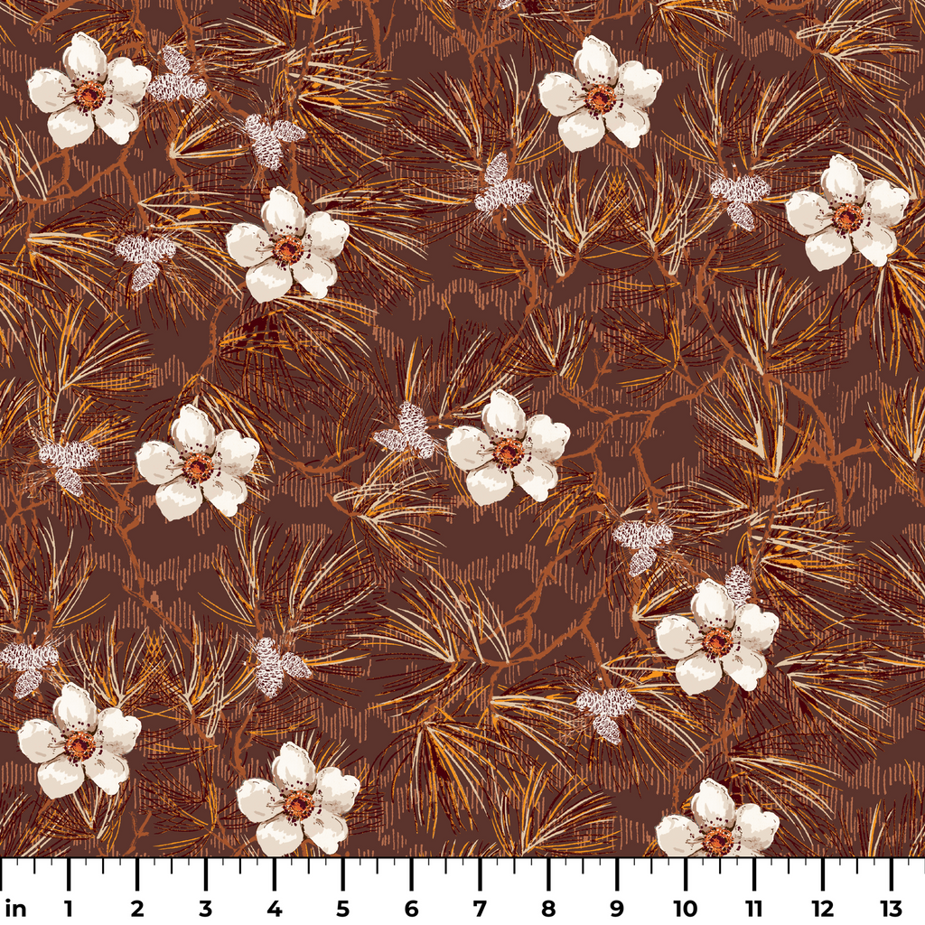 Elegant cream winter blossoms scattered across a rich brown background, perfect for home decor with a classic holiday floral motif.