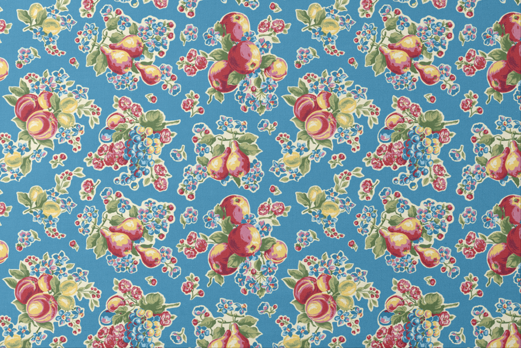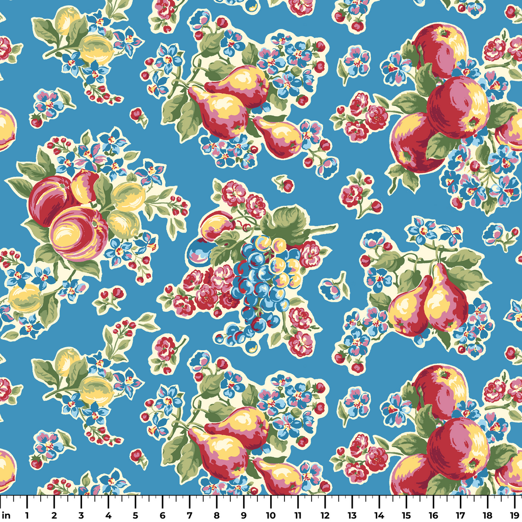Vibrant vintage-inspired fruit pattern featuring red apples, yellow pears, and small blue and pink florals on classic blue - perfect for a retro kitchen or cottage style home.