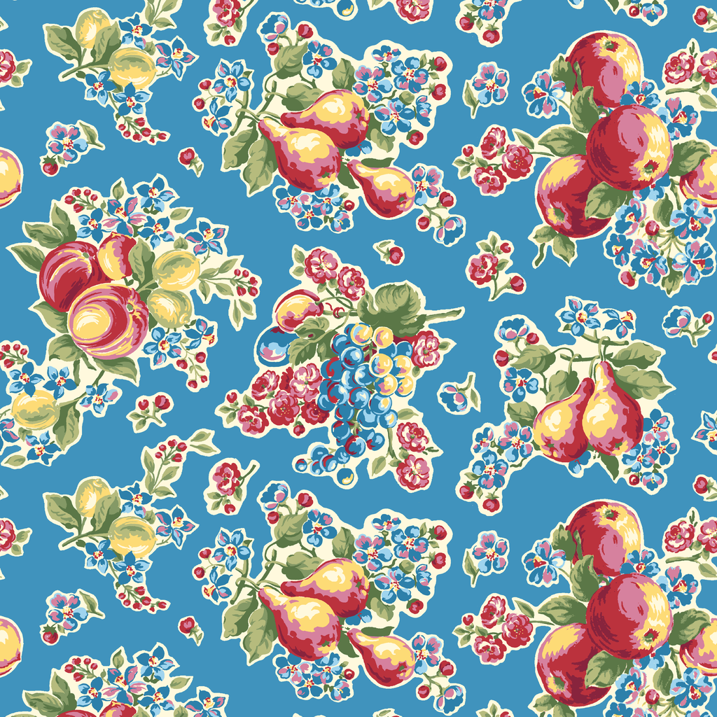 Vibrant vintage-inspired fruit pattern featuring red apples, yellow pears, and small blue and pink florals on classic blue - perfect for a retro kitchen or cottage style home.