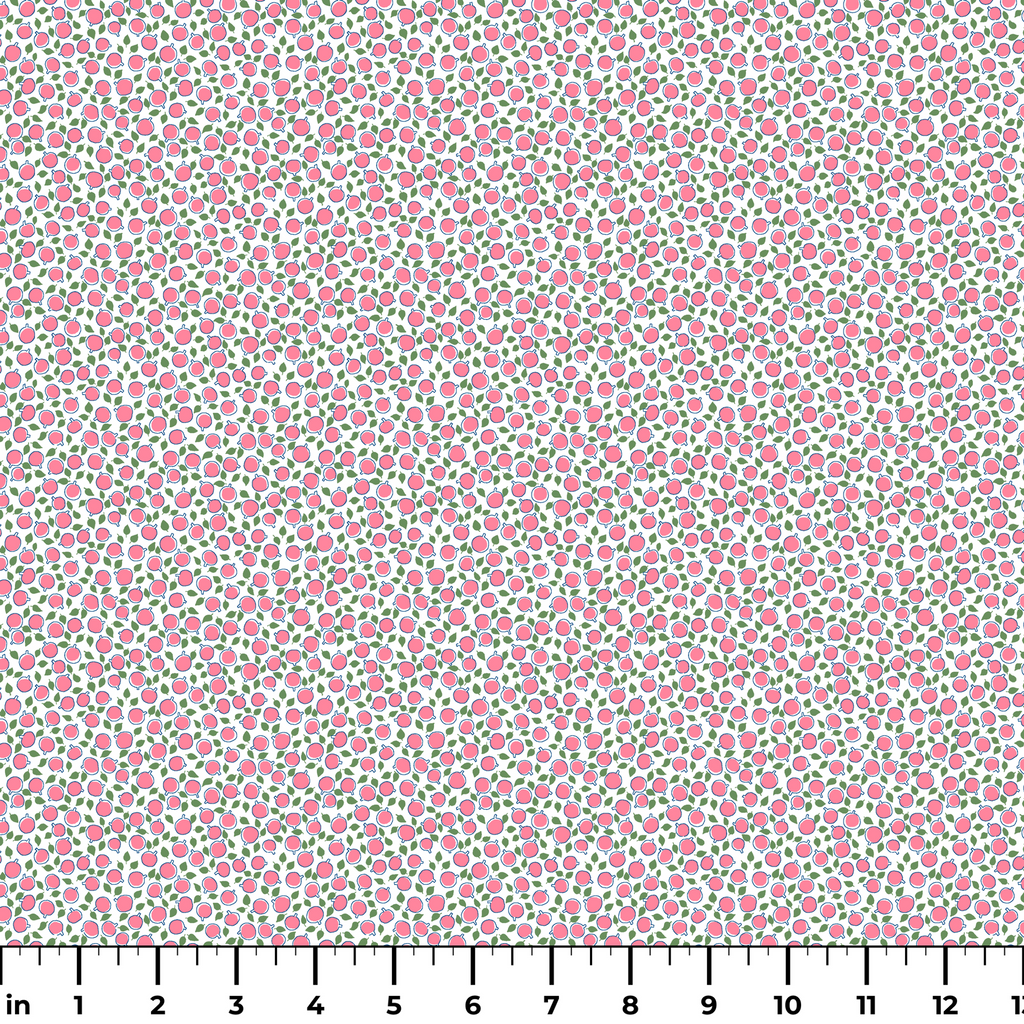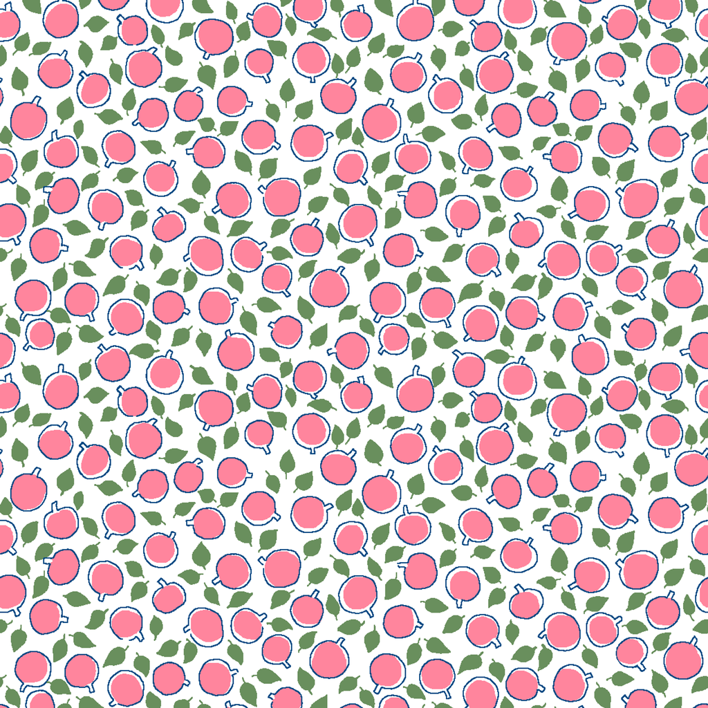 Charming pink apples dance across a crisp white background, each outlined in a playful navy blue and scattered among olive-green leaves. The whimsical, hand-drawn quality gives this pattern a fresh, modern take on a classic fruit motif. This delightful fabric would bring a touch of orchard sweetness to kitchen accessories like aprons and tea towels, or create the perfect lining for a child's lunch bag.